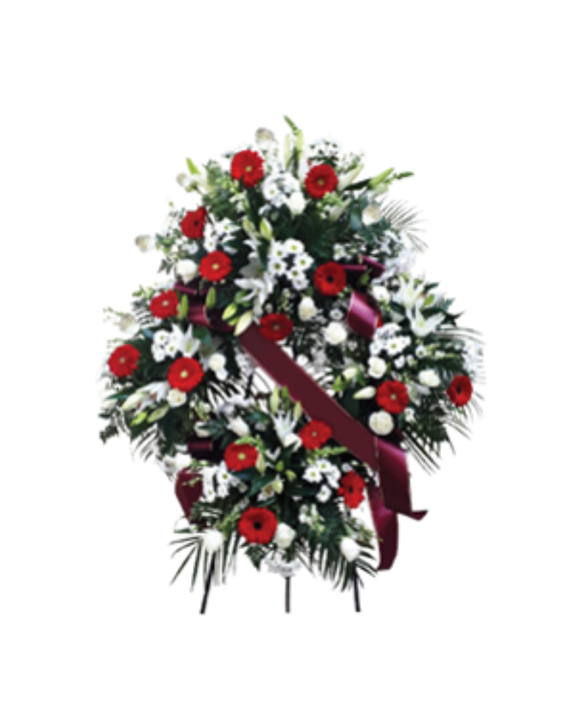 Referencia GMEAFL046Compuesto por: Aro 80 cm. con 4 cabezales, 16 gerberas, 12 varas de margaritas, 8 delphinium, 5 varas de lilium, 15 varas de solidago, 10 lisianthus, 20 rosas de tallo corto con verdes variados y cinta funeraria.