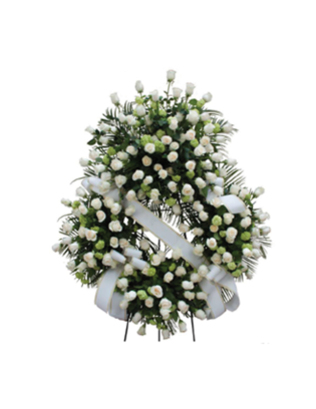 Referencia GMEAFL048Compuesto por: Aro 70-80 cm. con 4 cabezales, 150 rosas, 20 viburnum, 20 hojas de robelini con verdes variados y cinta funeraria.