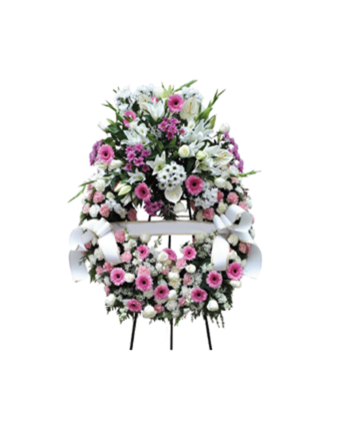 Referencia GMEAFL049Compuesto por: Aro de 70-80 cm. con 1 cabezal, 18 gerberas, 18 rosas, 3 anthurium, 6 lilium, 8 varas de margaritas, paniculata, 60 claveles con verdes variados y cinta funeraria.