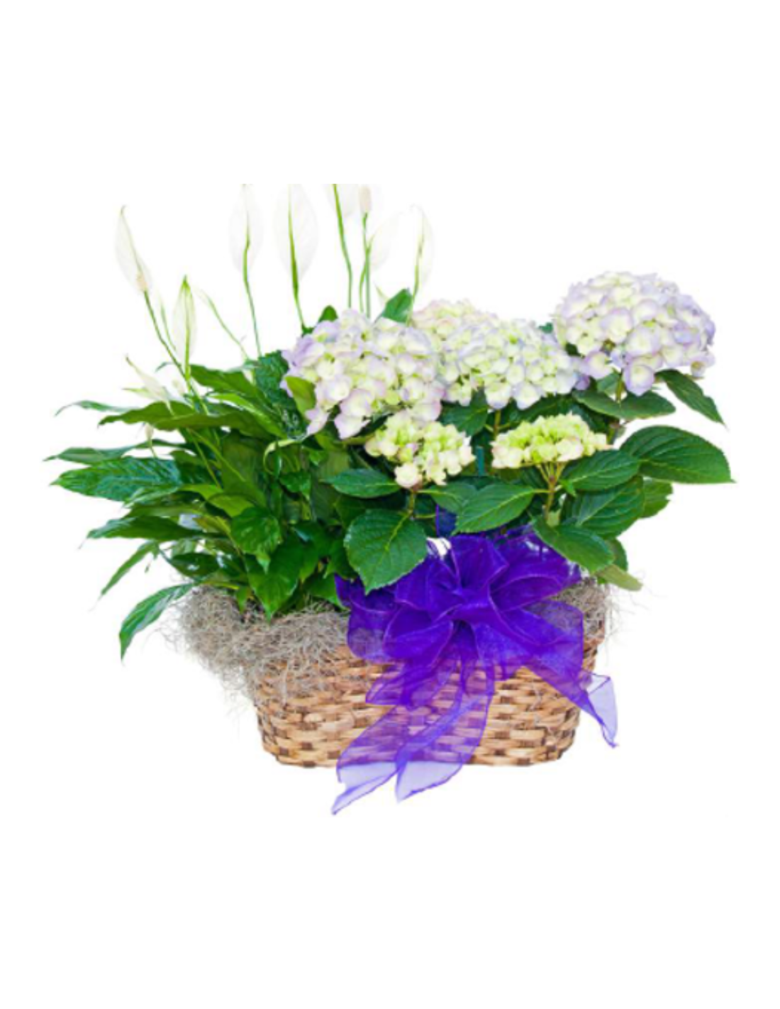 Referencia GMEAFL030Compuesto por: 1 Spathiphyllum, 1 hortensia, cesta de mimbre con decoración adicional