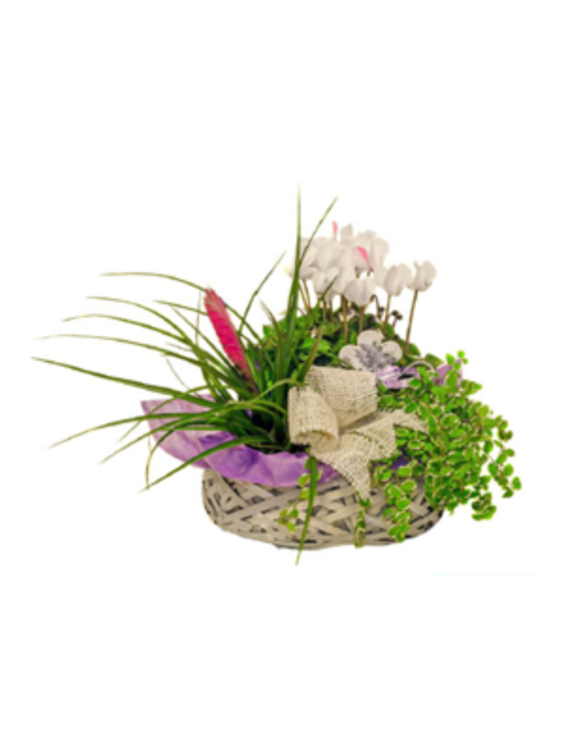Referencia GMEAFL025Compuesto por: 2 Plantas con flor, 1 planta sin flor, cesta mimbre con decoración adicional y lazo.