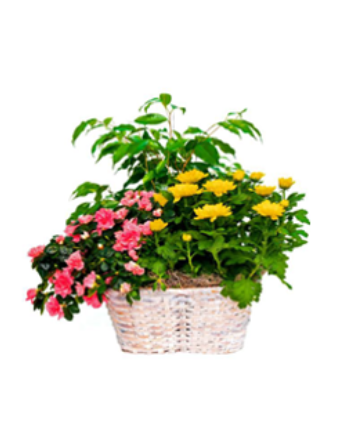 Referencia GMEAFL026Compuesto por: 2 plantas con flor, 1 planta sin flor, cesta mimbre con decoración adicional y lazo.