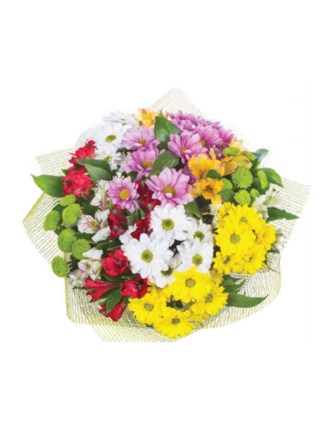 Referencia GMEAFL001Compuesto por: 8 Varas de margaritas, 5 alstroemerias, verdes variados con celofán y lazo.