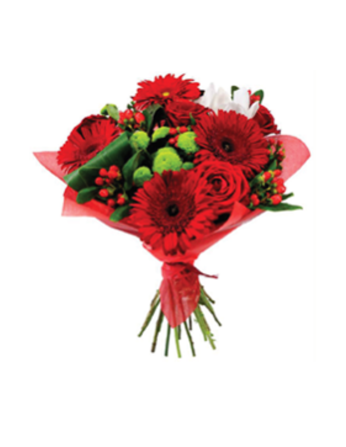 Referencia GMEAFL0024 Gerberas, 3 rosas, 2 varas de margarita botón verde, 3 varas hypericum, verdes variados con celofán y lazo