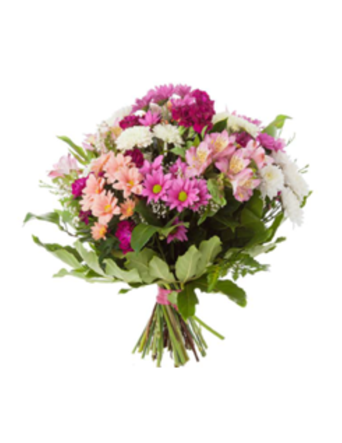 Referencia GMEAFL005Compuesto por: 8 Varas de margaritas, 8 alstroemerias, paniculata, verdes variados, celofán y lazo.