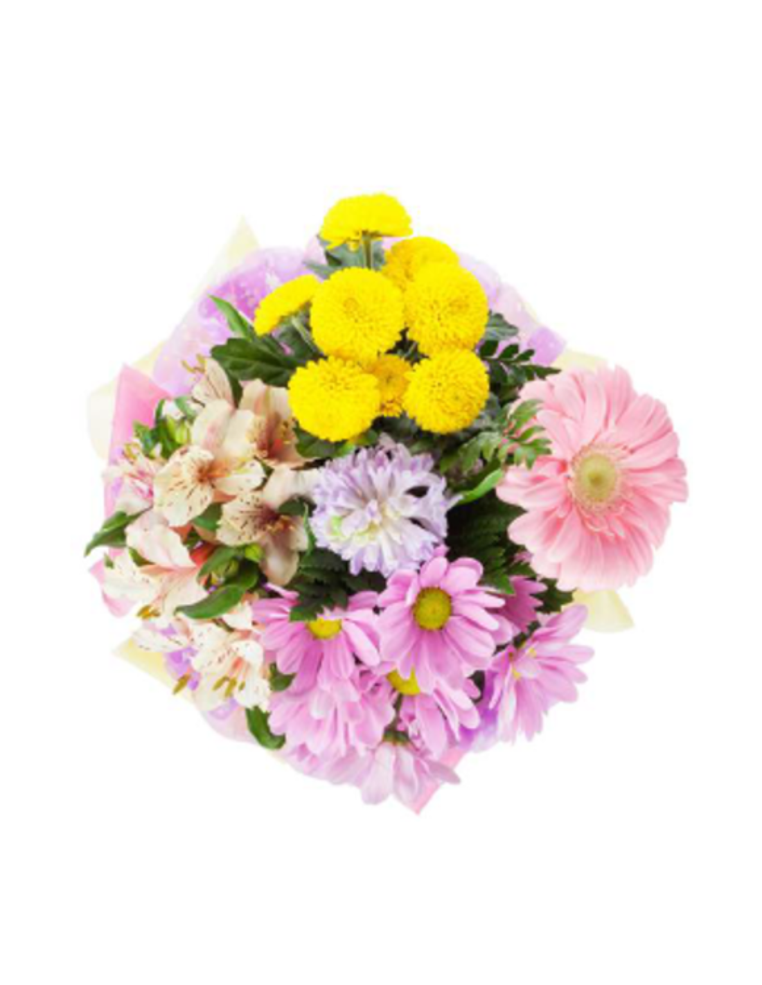 Referencia GMEAFL006Compuesto por: 3 Varas de margaritas, 1 gerbera, 2 alstroemerias, 1 clavel, verdes variados con celofán y lazo.