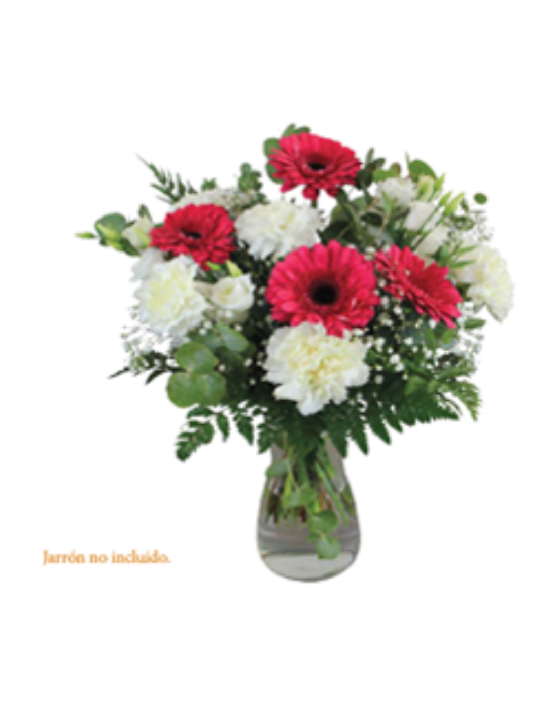 Referencia GMEAFL008Compuesto por: 4 Gerberas, 5 claveles, 2 lisianthus, paniculata, verdes variados con celofán y lazo. Jarrón no incluido.