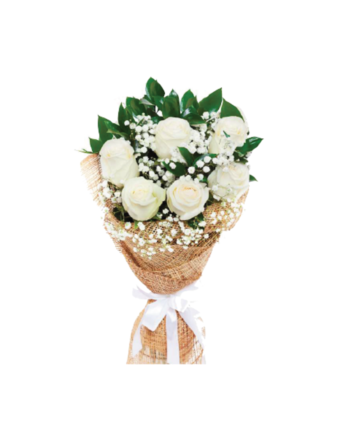 Referencia GMEAFL036Compuesto por: 6 Rosas, paniculata, verdes variados, celofán y lazo.