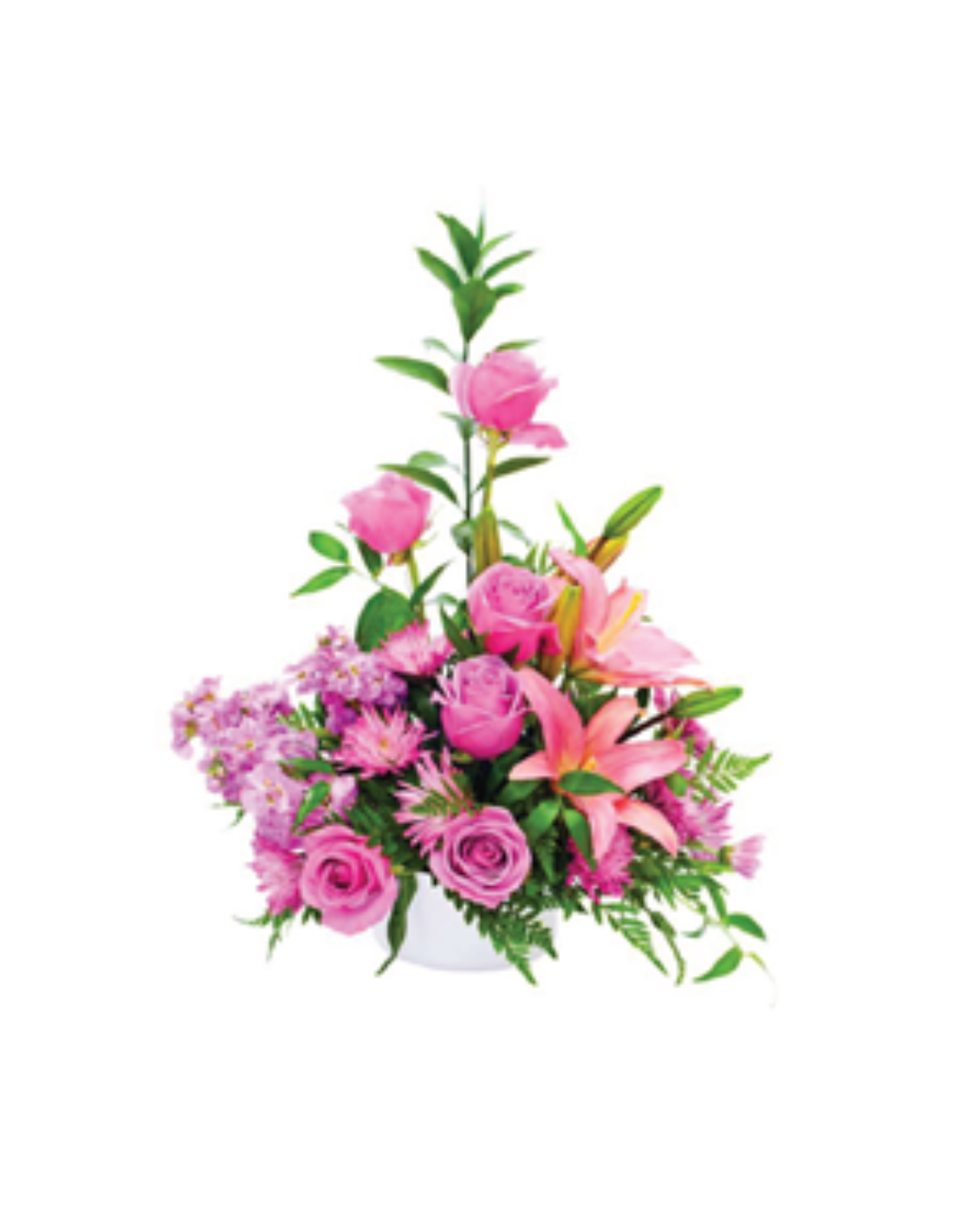Referencia GMEAFL038Compuesto por: 6 Rosas, 3 margaritas, 2 lilium LA con verdes variados, base de cerámica y esponja