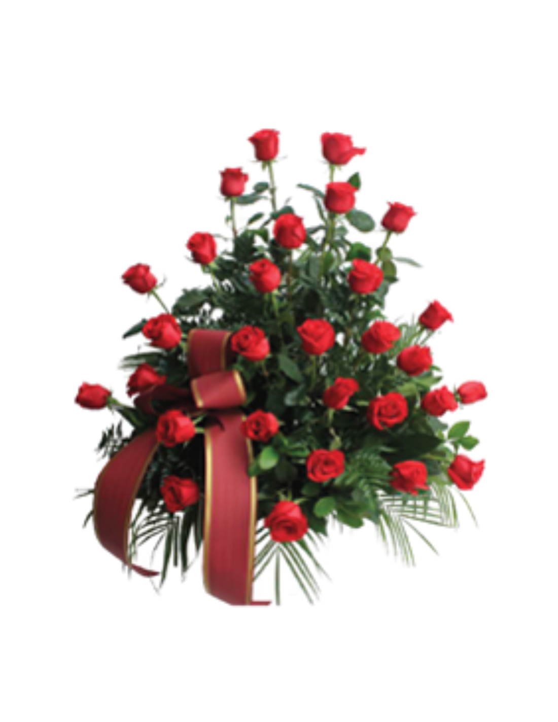Referencia GMEAFL059Compuesto por: 30 Rosas con verdes variados, esponja y cinta funeraria.