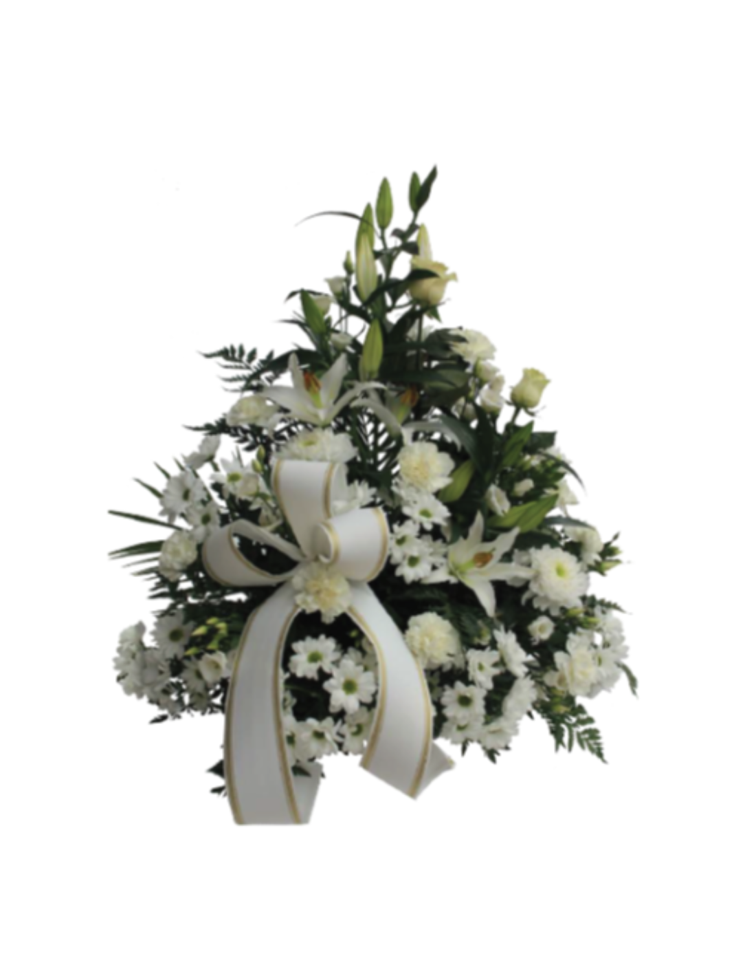 Referencia GMEAFL062Compuesto por: 5 Liliums, 2 rosas, 7 claveles, 6 lisianthus, 6 margaritas, 2 crisantemos con verdes variados, esponja y cinta funeraria
