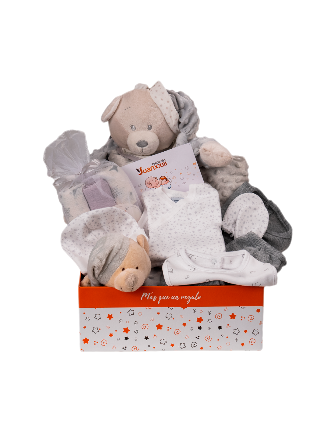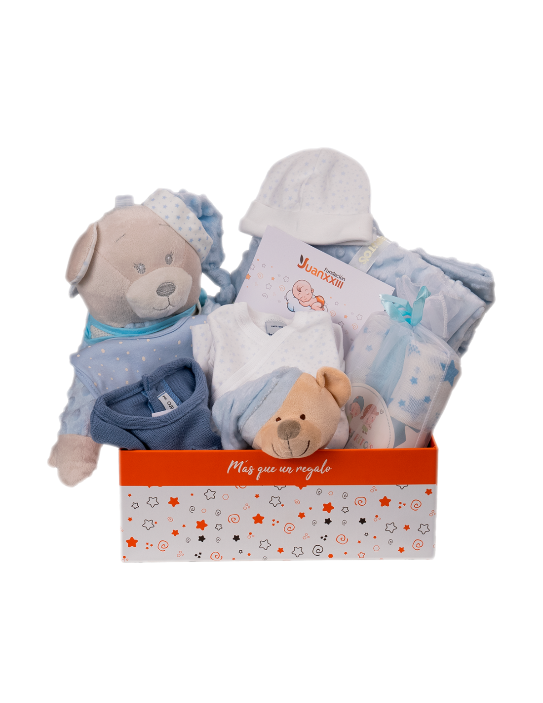 Referencia GMECAN351Compuesto por: Babero, Manta polar y peluche, Pack nacimiento 5 piezas (body, polaina, camiseta, gorro y manoplas), Pelele canesú (modelo según temporada), Estuche muselina estampada algodón 3 unidades, Guarda pañales peluche, Canastilla y Tarjeta Felicitación.