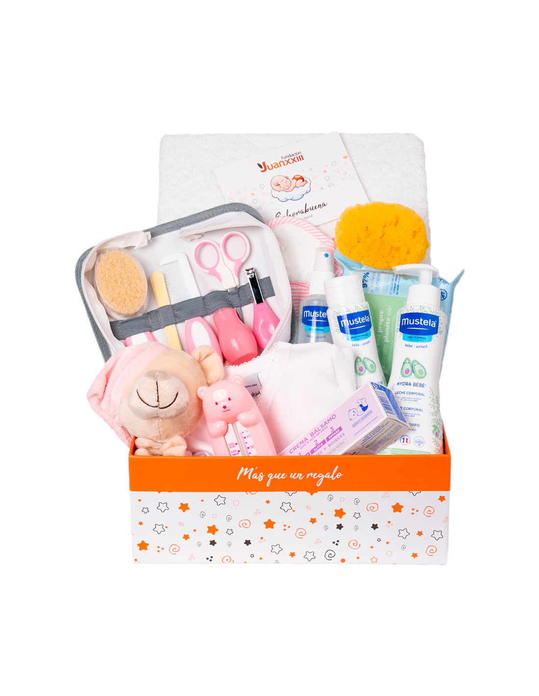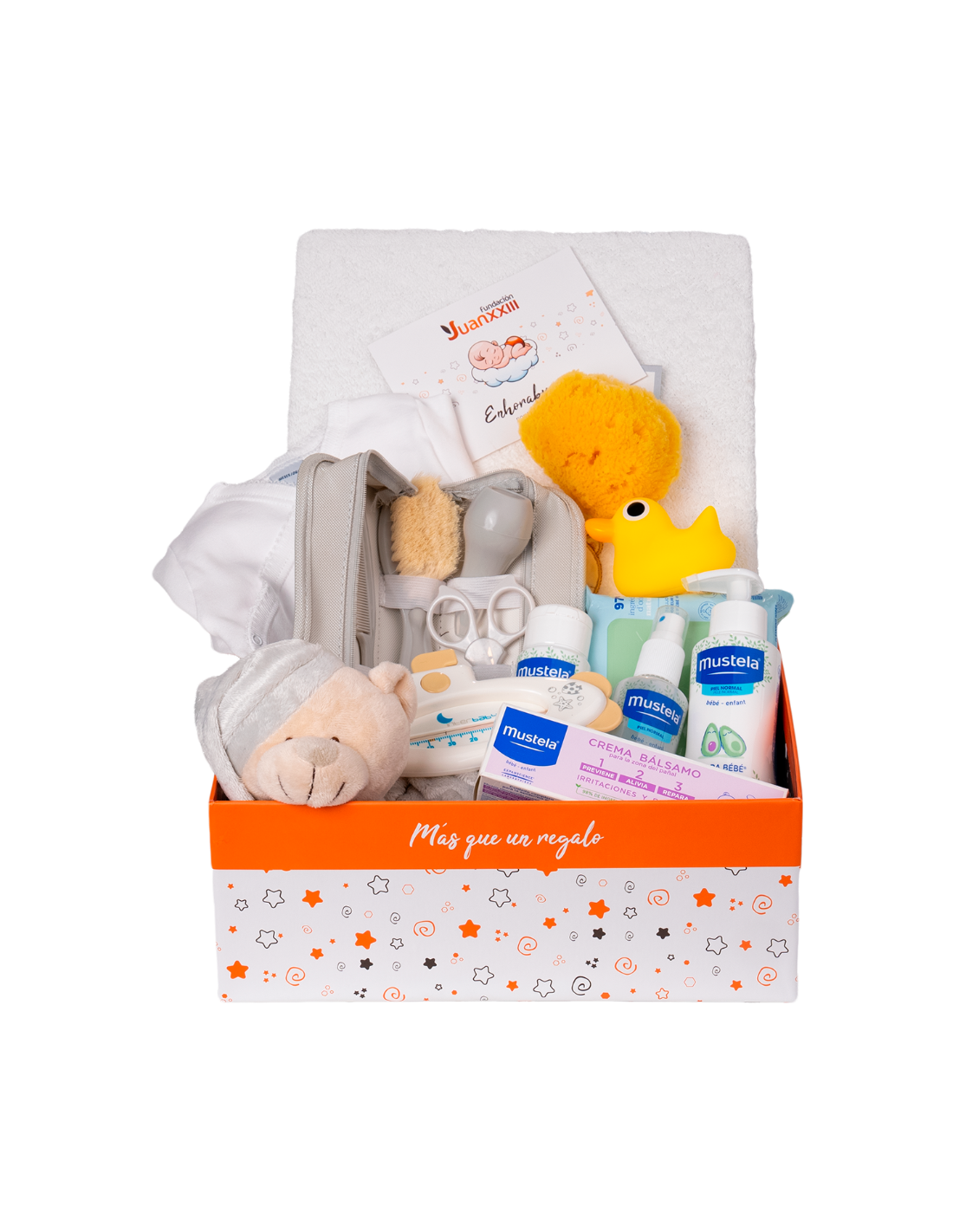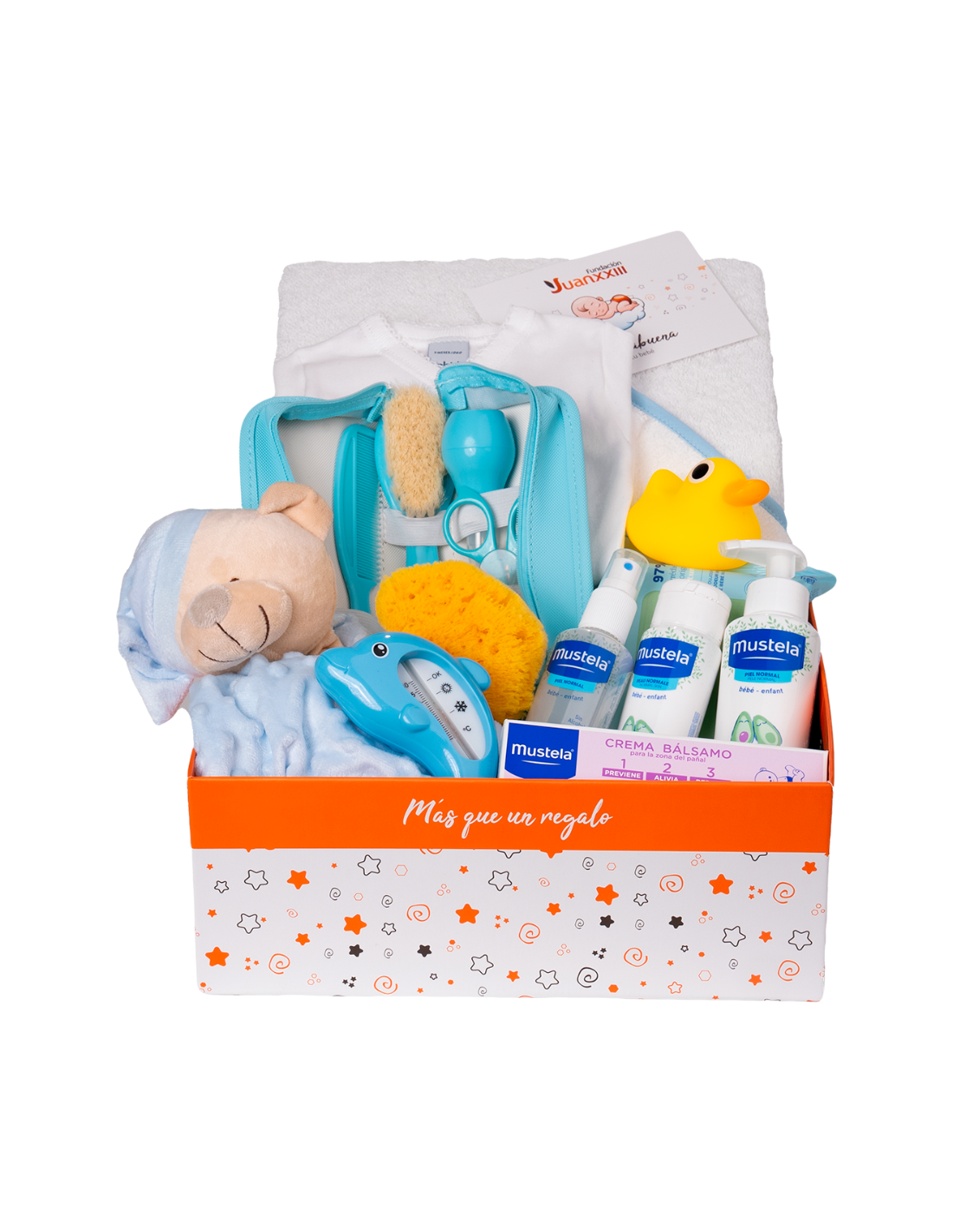 Referencia GMECAN312Compuesto por: Body cruzado, Capa de baño 100% algodón, Dou dou, Crema balsámica 1 2 3 50ml Mustela, Agua de colonia sin alcohol 200ml Mustela, Gel de baño suave 200ml Mustela, Leche corporal 300ml Mustela, Toallitas limpiadoras 70 unidades Mustela, Set manicura y peines, Termómetro de baño, Esponja de baño bebé, Patito agua, Canastilla y Tarjeta Felicitación.