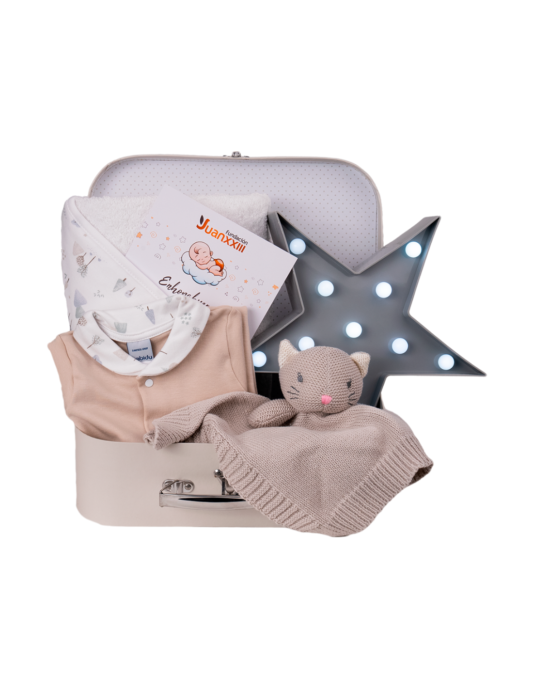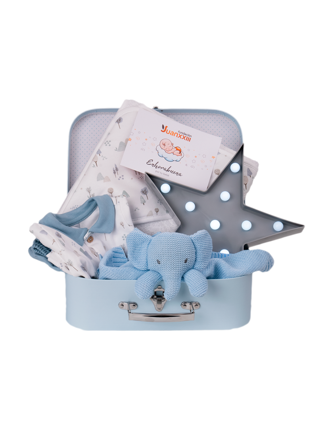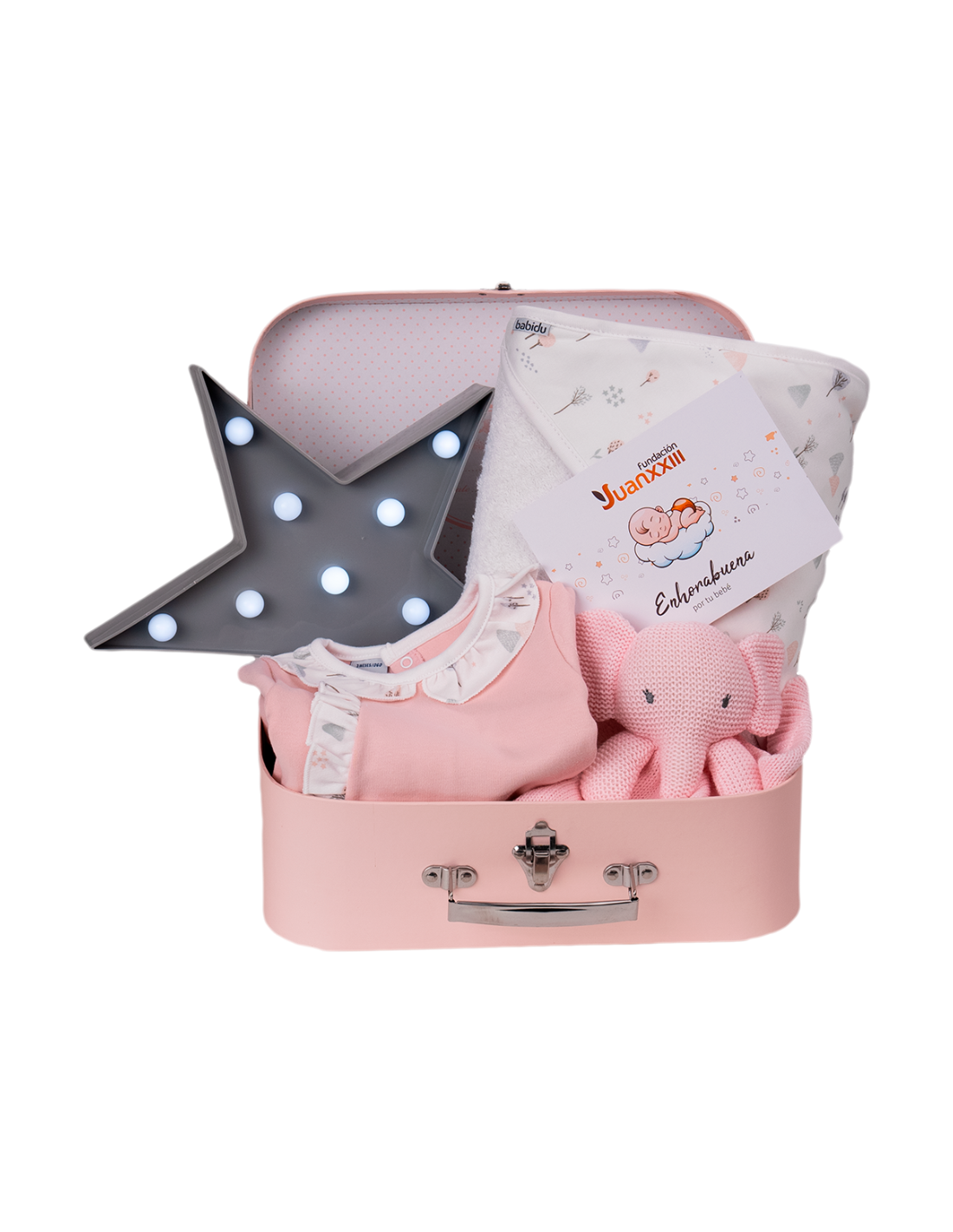 Compuesto por: Capa de Baño, Pelele Pijama, Dudú 25 Cm Elefante Algodón , Estrella 27.5*27.5*4.5 Cm Led , Maletita Cartón 30×20×9 y Tarjeta de Felicitación.