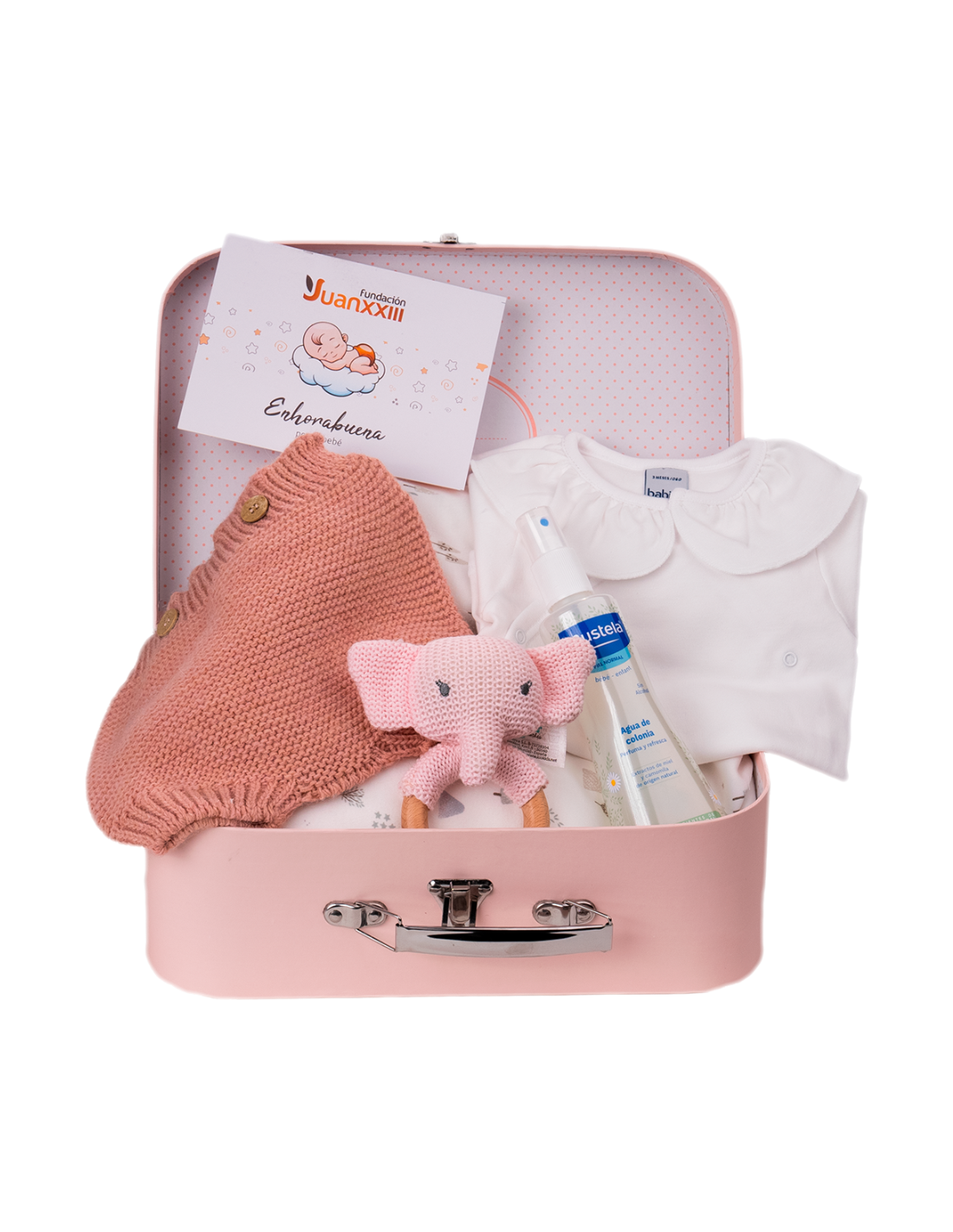 Referencia GMECAN625Compuesto por: Arrullo Polar, Body Cruzado C/Bebe, Pantalón con Tirantes, Agua de Colonia sin alcohol 200Ml Mustela, Elefante 13Cm Sonajero Algodón, Maletita Cartón 30×20×9 y Tarjeta de Felicitación.