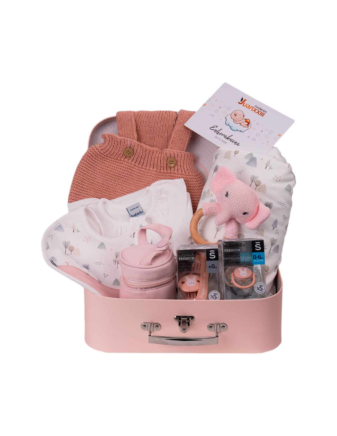 Compuesto por: Arrullo Polar, Babero, Portachupete, Chupete 0-6M Suavinex, Broche Cinta con Pinza Suavinex, Body Cruzado C/Bebe, Pantalón con Tirantes, Elefante 13Cm  Sonajero Algodón, Maletita Cartón 30×20×9 y Tarjeta de Felicitación.