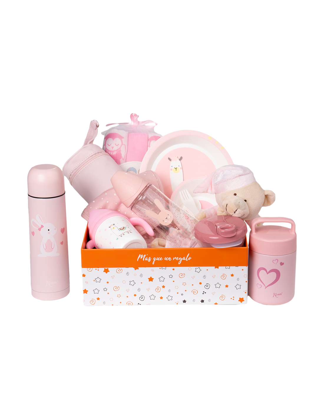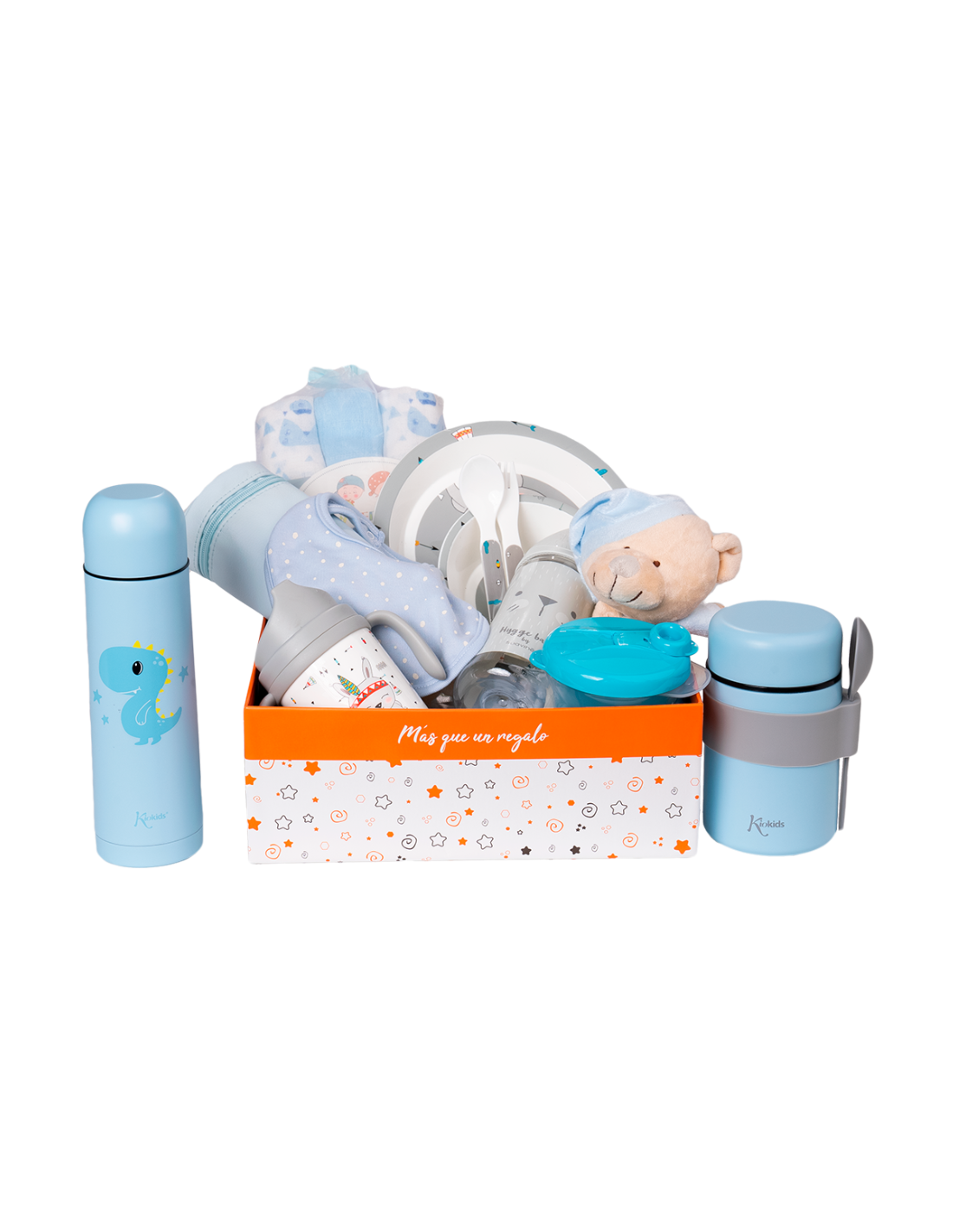 Compuesto por: Babero, Body cuello piqué algodón, Manta polar y peluche, Estuche muselina estampada algodón 3 unidades, Set vajilla infantil 5 piezas, Dispensador de leche, Biberón 270ml Suavinex, Funda biberón, Termo 500 ml acero inoxidable, Termo papillero 400ml, Canastilla y Tarjeta Felicitación.