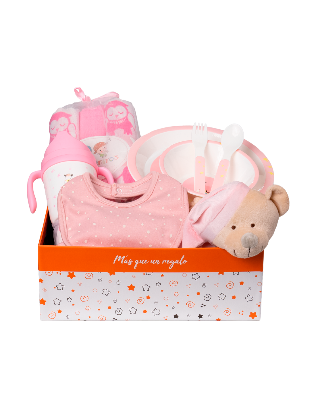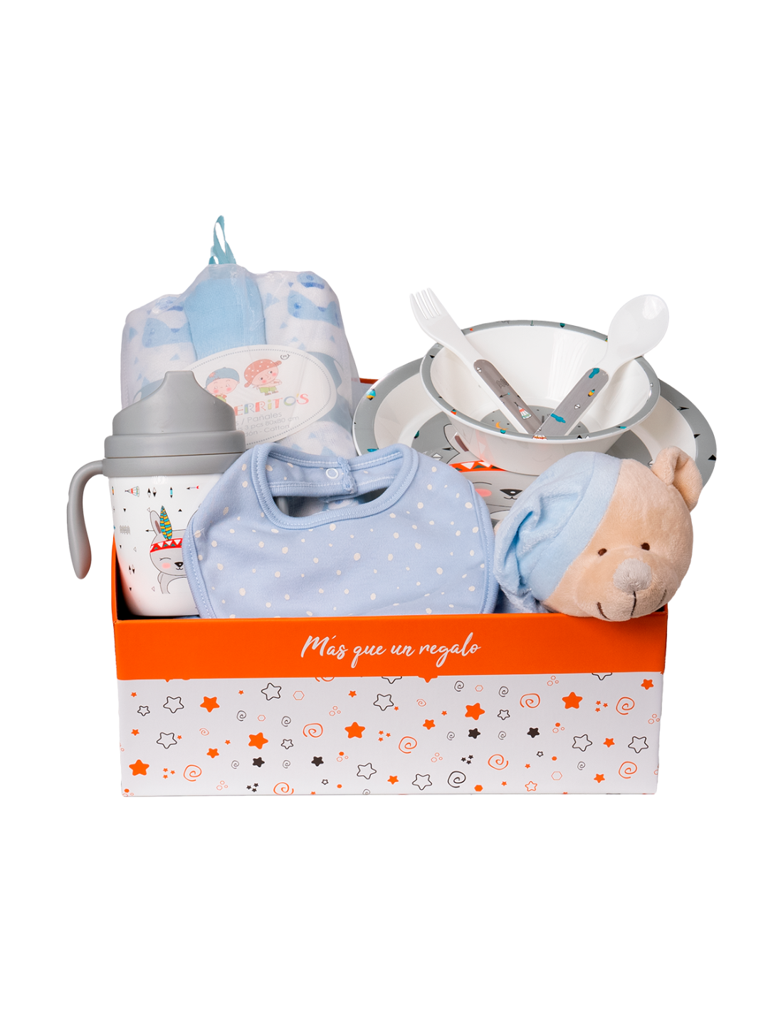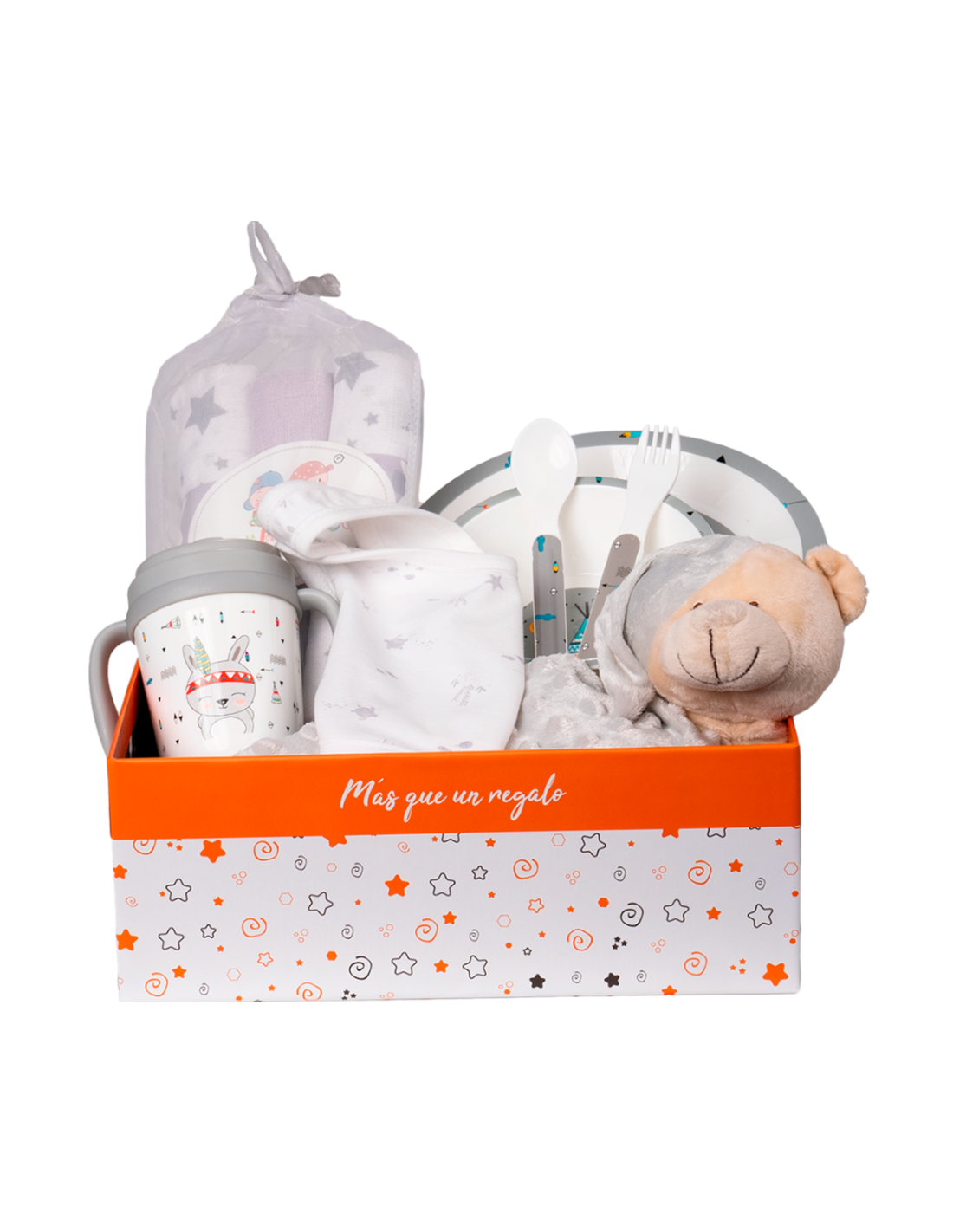 Compuesto por: Babero, Dou dou, Estuche muselina estampada algodón 3 unidades, Set vajilla infantil 5 piezas, Canastilla y Tarjeta Felicitación.
