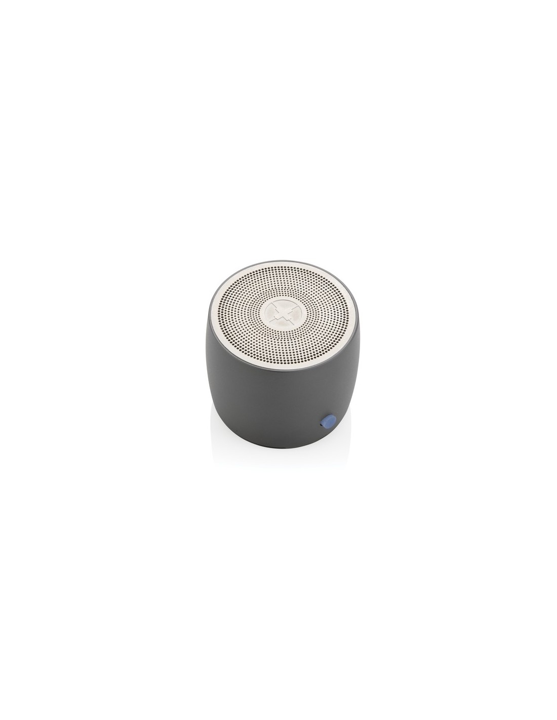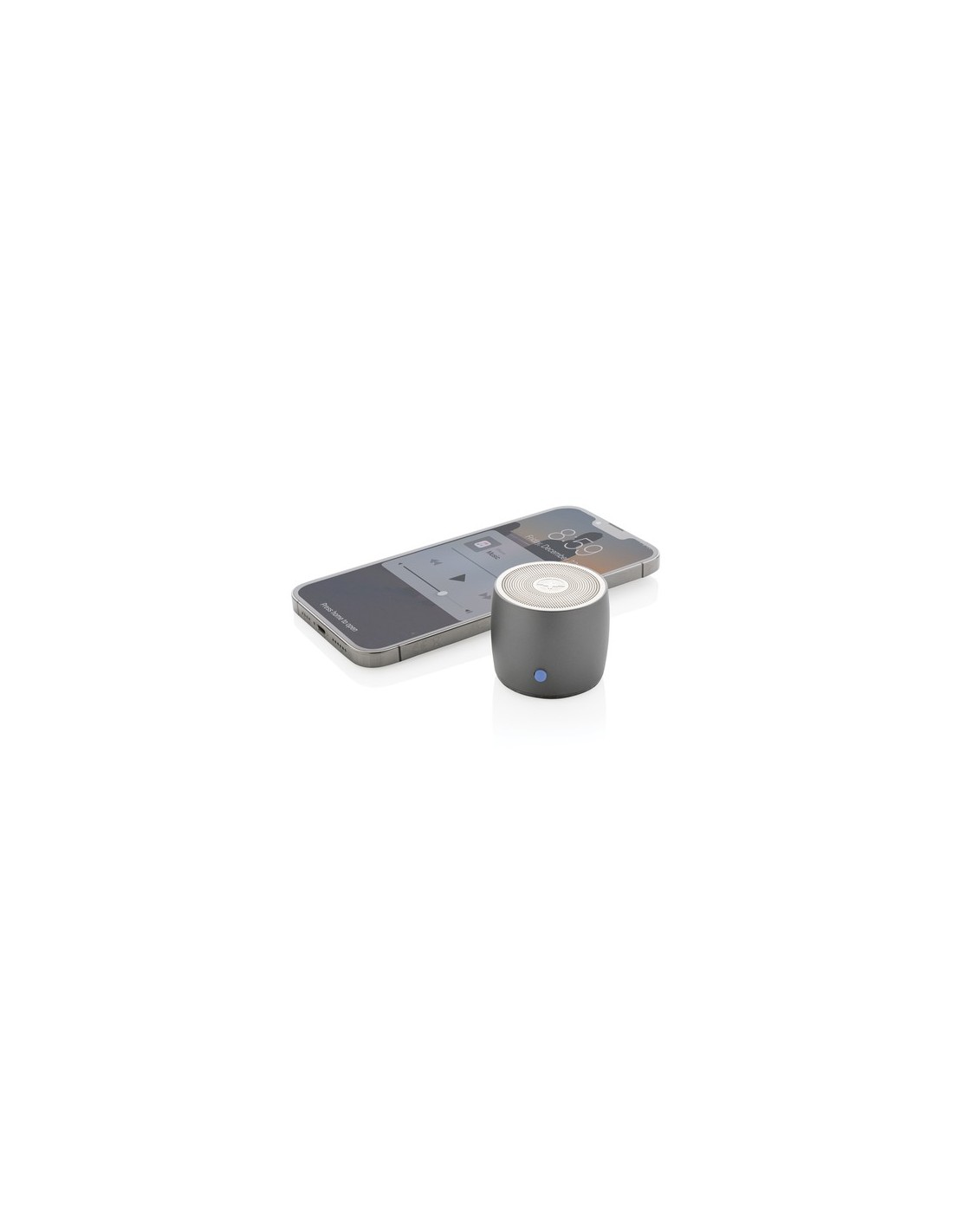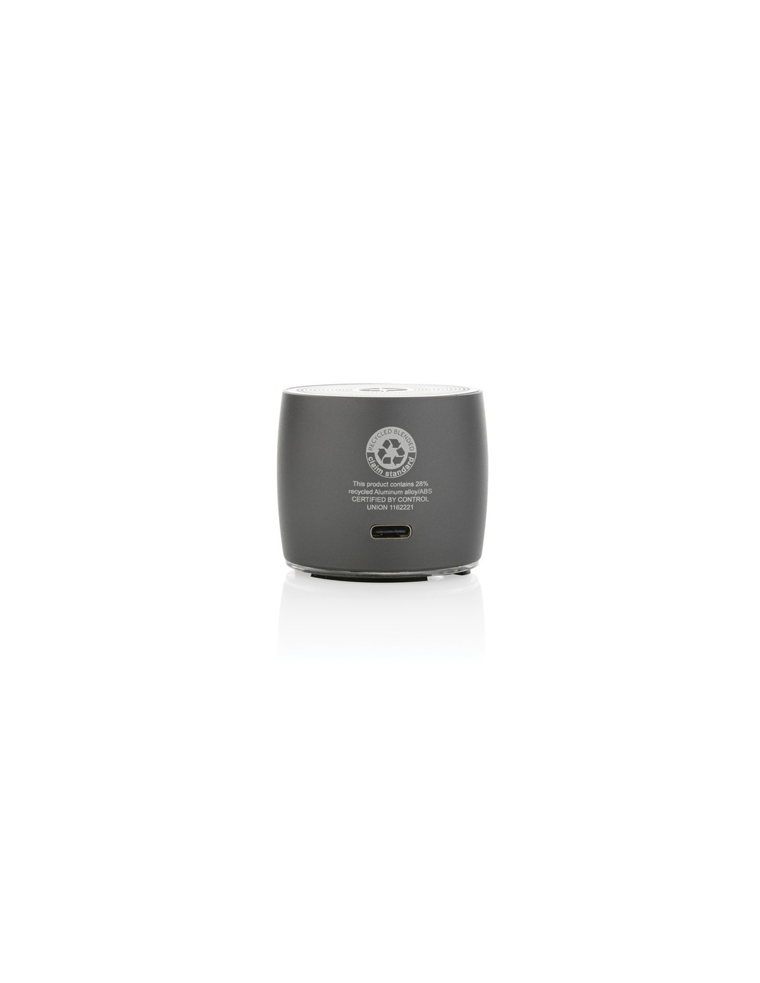 Pequeño pero potente altavoz inalámbrico de 3W fabricado con aluminio reciclado certificado RCS (Recycled Claim Standard) y ABS reciclado. Contenido reciclado total: 28% basado en el peso total del artículo. La certificación RCS garantiza una cadena de suministro completamente certificada de los materiales reciclados. El aluminio no pierde sus características en el proceso de reciclaje y puede reciclarse infinitamente. Incluye cable de carga tipo C reciclado fabricado con TPE reciclado certificado por RCS. Envasado en envase mixto FSC®. La batería de 500 mah permite un tiempo de reproducción de hasta 4 horas y se puede recargar por completo en 2 horas. Con BT 5.0 para una conexión fluida hasta 10 metros. Artículo y accesorios libres de PVC. Material : Aleación de aluminio reciclada Recycled Content Percent : 28 certificado de Recycled Claim Standard, Conforme directiva equipamientos Radio y Telecomunicaciones 2014/53/EU, Conforme directiva de sustancias peligrosas 2011/65/EC & 2015/863, Conforme PAHS content in Reach & ZEK 01-4-08, Conforme directiva Phtalate content, Libre de parafinas cloradas de cadena corta y media. WEEE Battery : 1 Li-ion - 503035 - 8,2 g. Packaging : Caja de regalo All print codes : Laser Engraving 2,Pad Print - Print code default : Grabado a láser - parte frontal del artículo - 20 x 15 mm - max color : 1 Social Audits : BSCI Total CO2 emissions : 2,81.