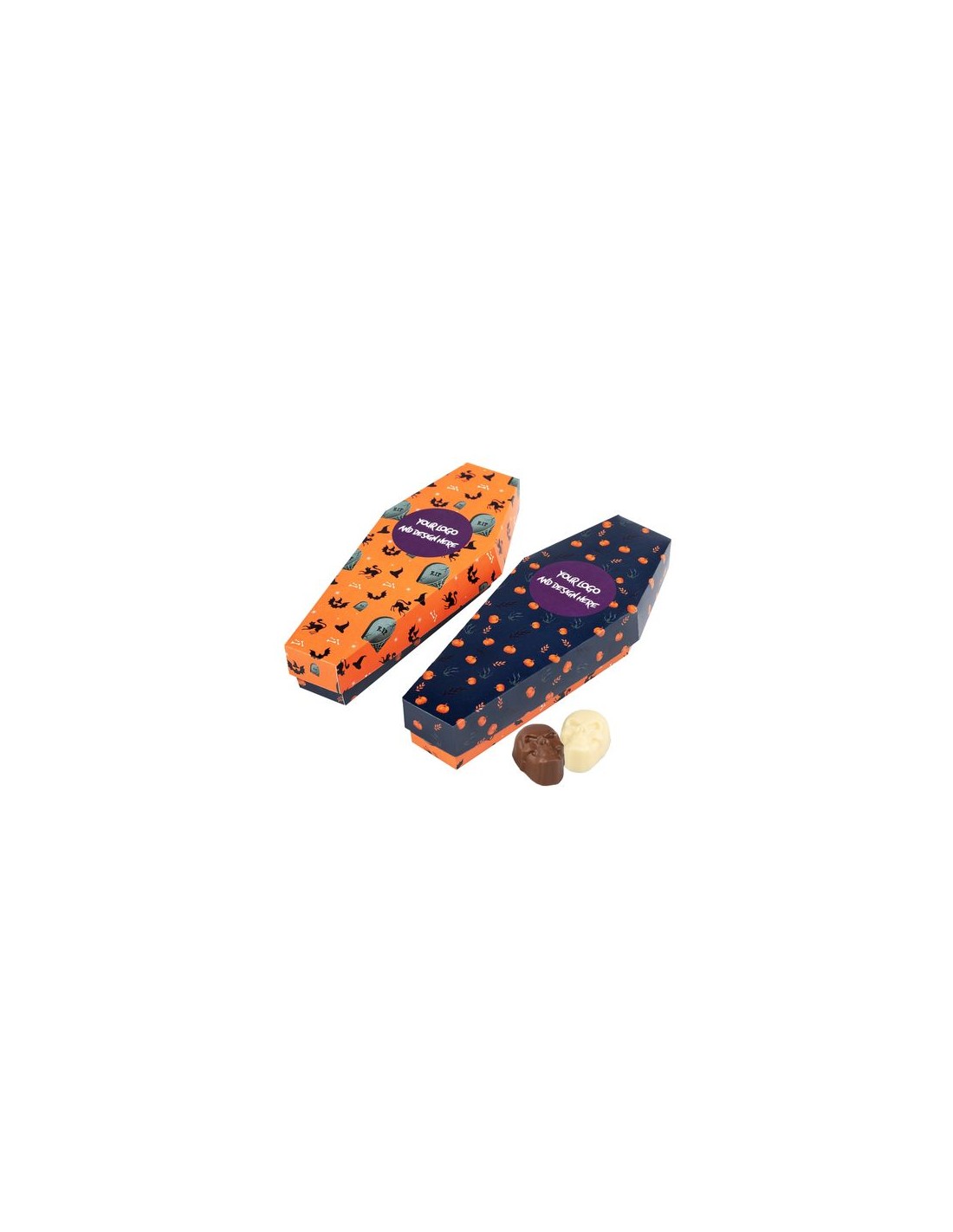 Contenido: pralinés surtidos de calavera y tibias cruzadas 60 gSaboro: chocolate con leche relleno de hibisco y limón y chocolate blanco relleno de pistachoOpciones de producto: papel blanco, papel kraft o papel sin blanquear con fibras de hierba añadidasInforomación adicional: envase 100% biodegradableDimensiones : 182 x 70 x32 mmCantidad Mínimo: 100 ejemplares. Fecha de caducidad mínima : 4 mesesTipo de impresión: digital.