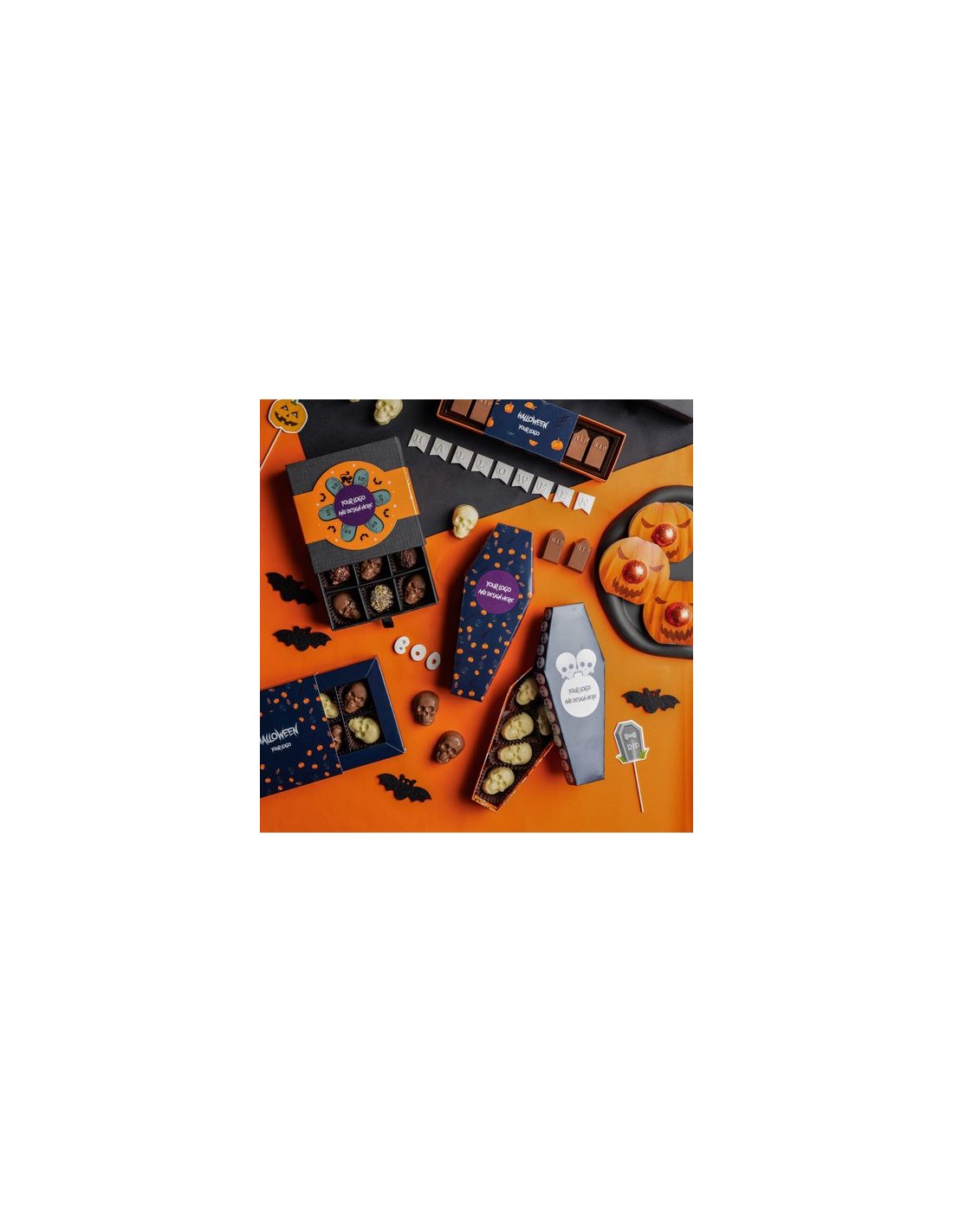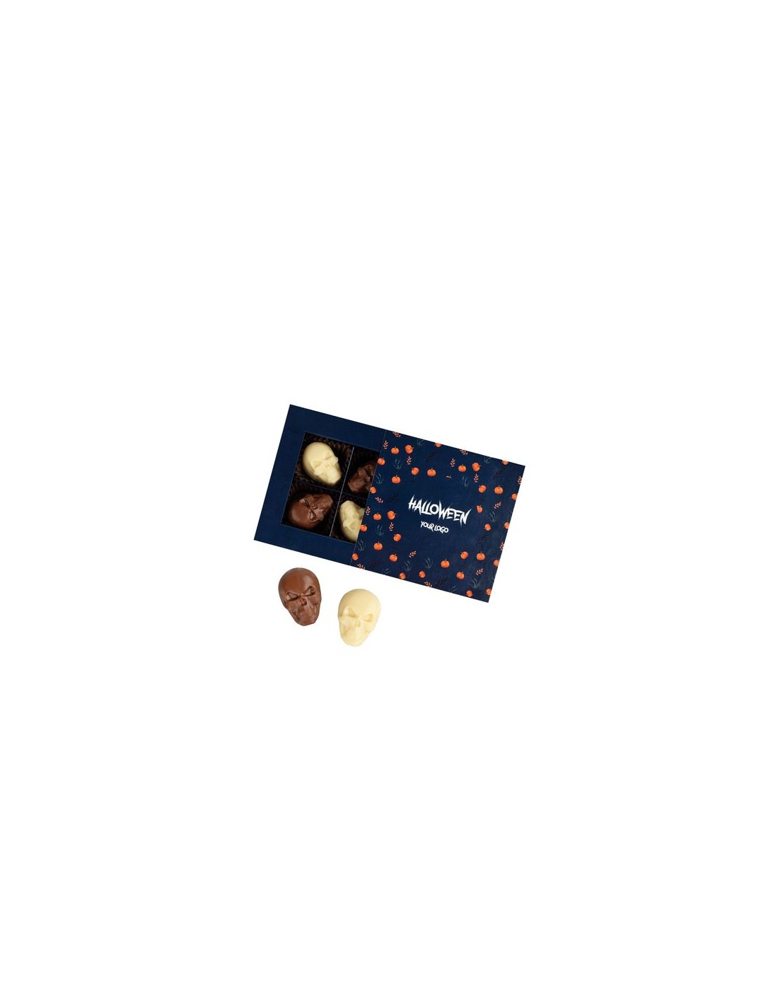 contenido : SURTIDO de pralines calavera 40 g (mezcla de sabores)Saboro : chocolate con leche relleno de hibisco y limón y chocolate blanco relleno con pistachoOpciones de producto : papel blanco, papel kraft o papel crudo con ajot de fibras de hierbaInforomación adicional : envasado biodégradable a 100%, papel blanco de serie, papel kraft o papel crudo con ajot de fibras de hierba elección opcionalDimensiones : 105 x 105 x 23 mmCantidad Mínimo : 100 exFecha de caducidad mínima : 4 mesesTipo de impresión : digital.
