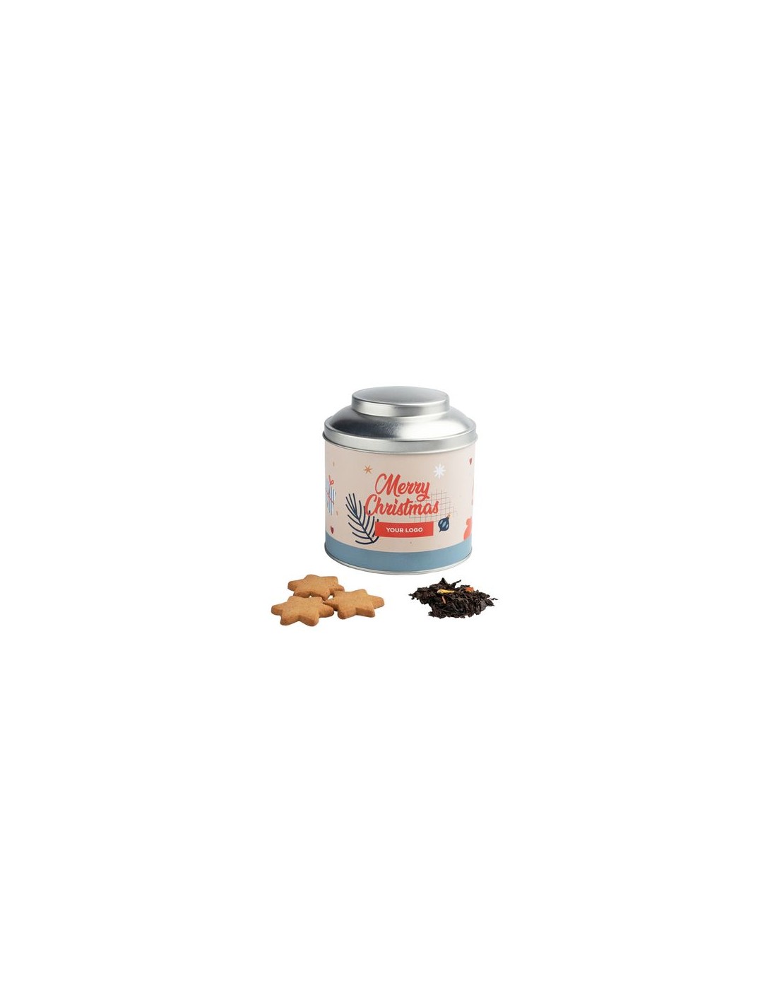 contenido : Caja de té en hojas sueltas (30 g) y GALLETAS de jengibre en forma de estrella con mantequilla y miel (50 g)Inforomación adicional : lata metálica reutilizable según el principio de "residuo cero", color de la etiqueta : blanco, té y GALLETAS envueltos en film 100% compostableDimensiones : Ø115, h 125 mmCantidad Mínimo : 100 exFecha de caducidad mínima : 6 mesesTipo de impresión : digital.