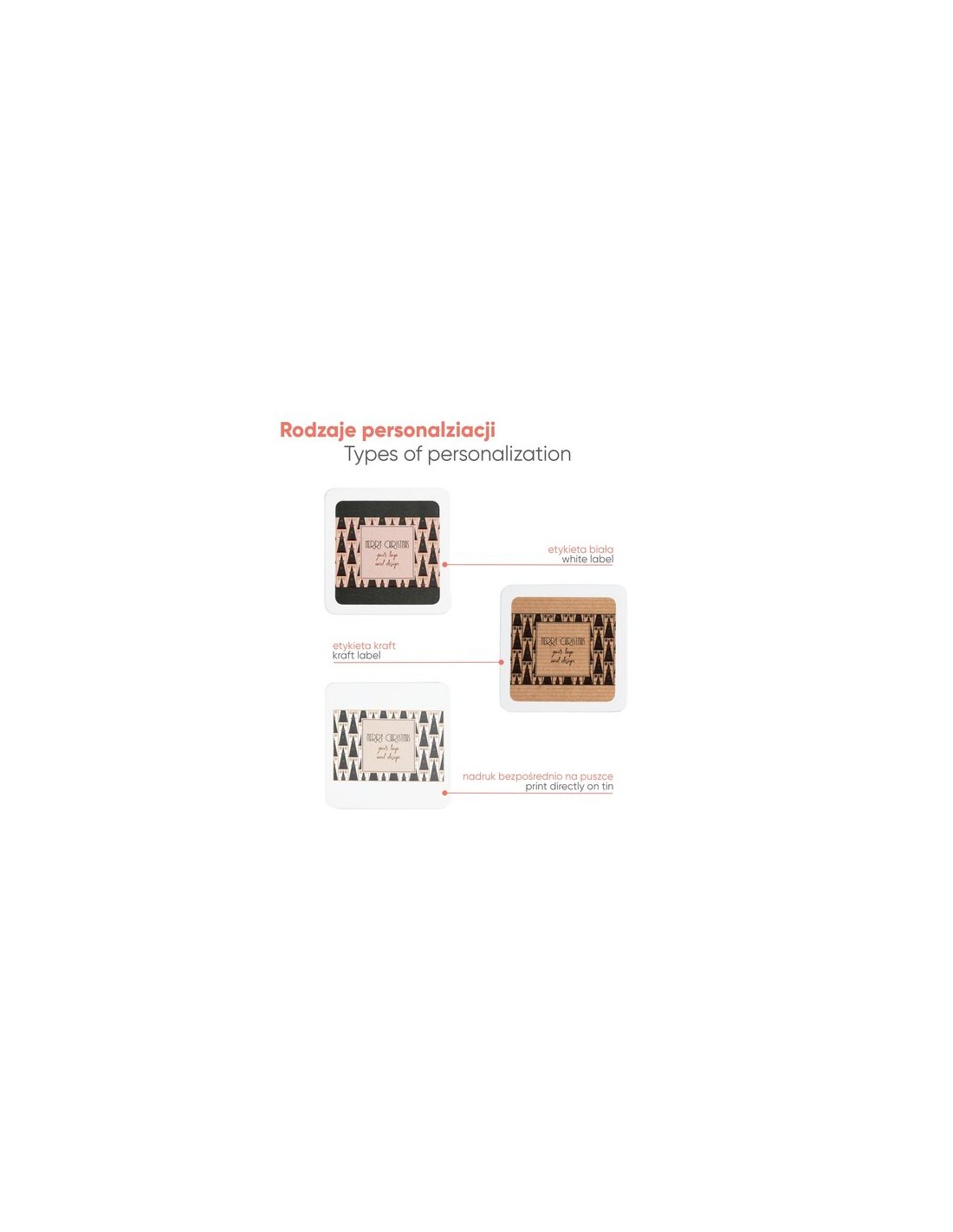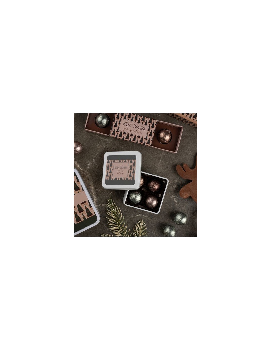 contenido : 4 pralines de chocolate rellenos (48 g en total)Saboro : chocolate con leche relleno de avellanas, chocolate con leche rellenos de nueces, mezcla de sabores: chocolate con leche relleno de almendras, chocolate con leche relleno de pistachos,Opciones de producto : color de la caja: blanco, etiqueta blanca o kraft, etiqueta o impresión directamente sobre la cajaInforomación adicional : caja metálica reutilizable según el principio de "residuo cero"., etiqueta en papel blanco de serie, papel kraft elección opcionalDimensiones : 75 x 75 x 32 mmCantidad Mínimo : 50 exFecha de caducidad mínima : 4 mesesTipo de impresión : directamente sobre la caja: digital, digital.