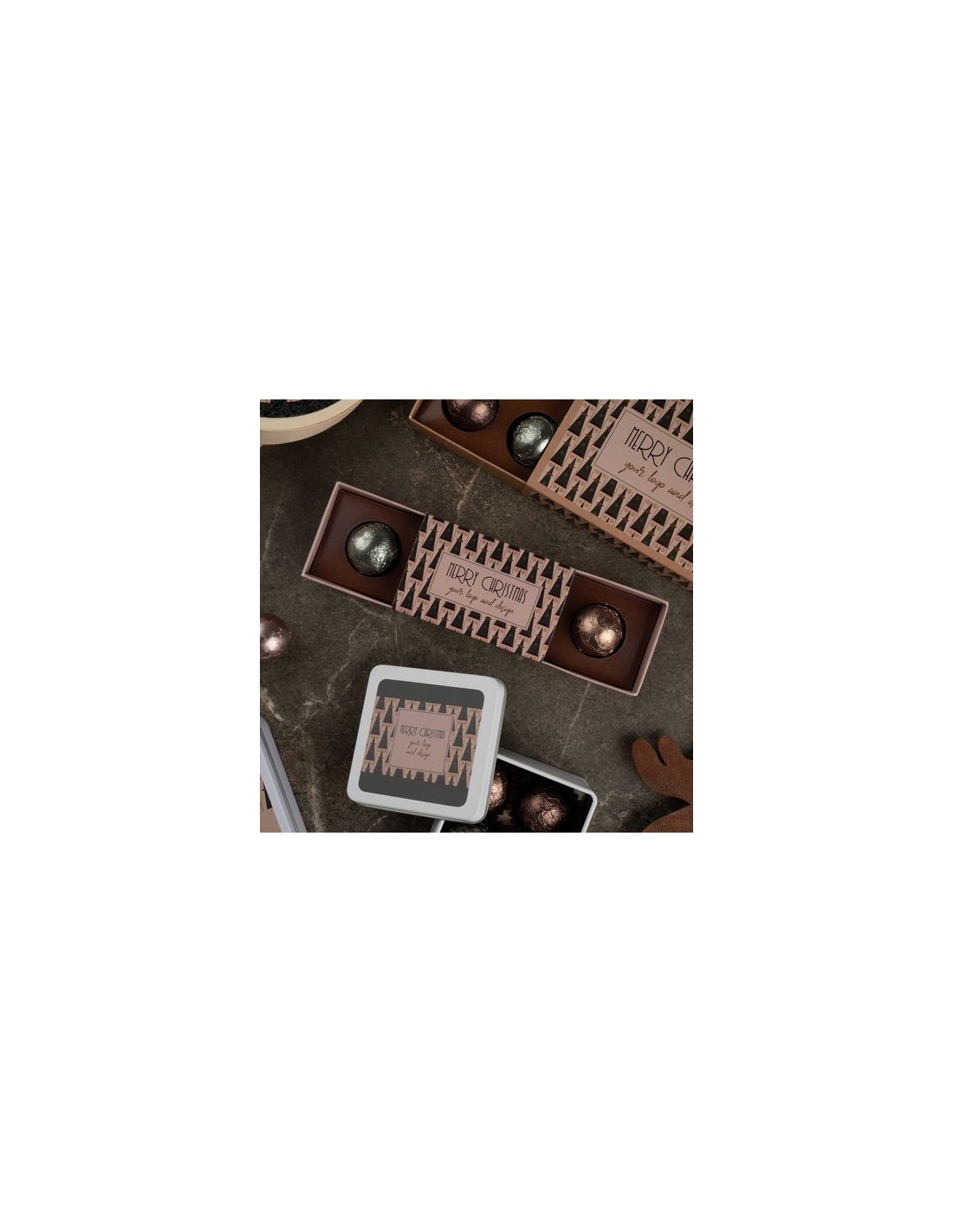 contenido : 4 pralines de chocolate rellenos (48 g en total)Saboro : chocolate con leche relleno de avellanas, chocolate con leche relleno de nueces, mezcla de sabores: chocolate con leche relleno de almendras, chocolate con leche relleno de pistachos,Opciones de producto : papel blanco, papel kraft o papel crudo con ajot de fibras de hierbaInforomación adicional : moldeado en R-PET (PET reciclado), papel blanco de serie, papel kraft o papel crudo con ajot de fibras de hierba elección opcional, posibilidad de personalizar el recuadro de papel que cose el estucheDimensiones : 55 x 190 x 30 mmCantidad Mínimo : 200 piezasFecha de caducidad mínima : 4 mesesTipo de impresión : digital.