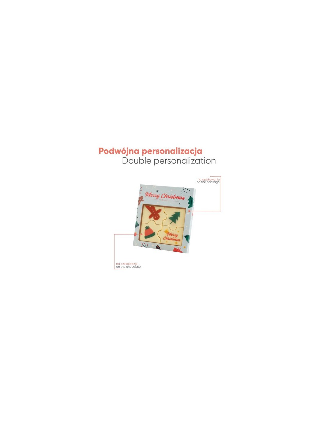 Contenido : surtido de bombones personalizados (total 30 g)Saboro : chocolate blanco 36% manteca de cacaoOpciones de producto : papel blanco, papel kraft o papel crudo con ajot de fibras de hierbaInforomación adicional : moldeado en R-PET (PET reciclado), papel blanco de serie, papel kraft o papel crudo con ajot de fibras de hierba elección opcional, posibilidad de personalizar el envase y el chocolate (elemento gráfico en el chocolate)Dimensiones : 95 x 107 x 16 mmCantidad Mínimo : 100 exFecha de caducidad mínima : 8 mesesTipo de impresión : chocolate: digital alimentos, envasado: digital.