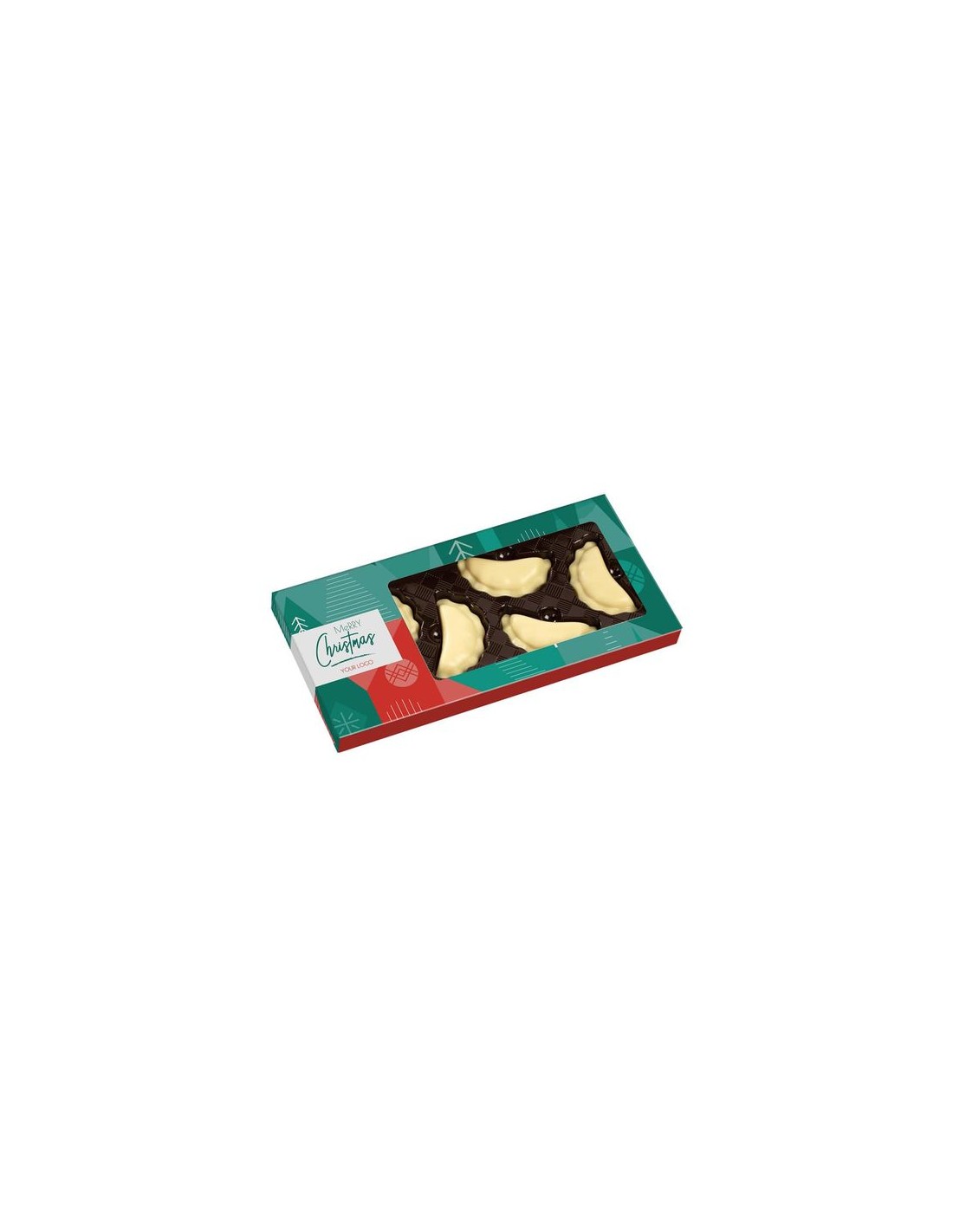 Contenido : chocolates en forma de raviolis (90 g en total)Saboro : chocolate con leche 33% cacao, chocolate blanco 36% manteca de cacao, chocolate negro 54% cacao, chocolate negro 72% cacao, chocolate rubí 47% cacao, chocolate Caramel Gold 40% cacao, chocolate con leche y miel al 33% de cacao, chocolate con leche sin azúcar 33% cacao, chocolate con leche - vegano 42% cacao, chocolate Wholefruit 72% sin azúcares añadidosOpciones de producto : papel blanco, papel kraft o papel crudo con ajot de fibras de hierbaInforomación adicional : moldeado en R-PET (PET reciclado), papel blanco de serie, papel kraft o papel crudo con ajot de fibras de hierba elección opcionalDimensiones : 265 x 125 x 20 mmCantidad Mínimo : 100 exFecha de caducidad mínima : 8 mesesTipo de impresión : digital.