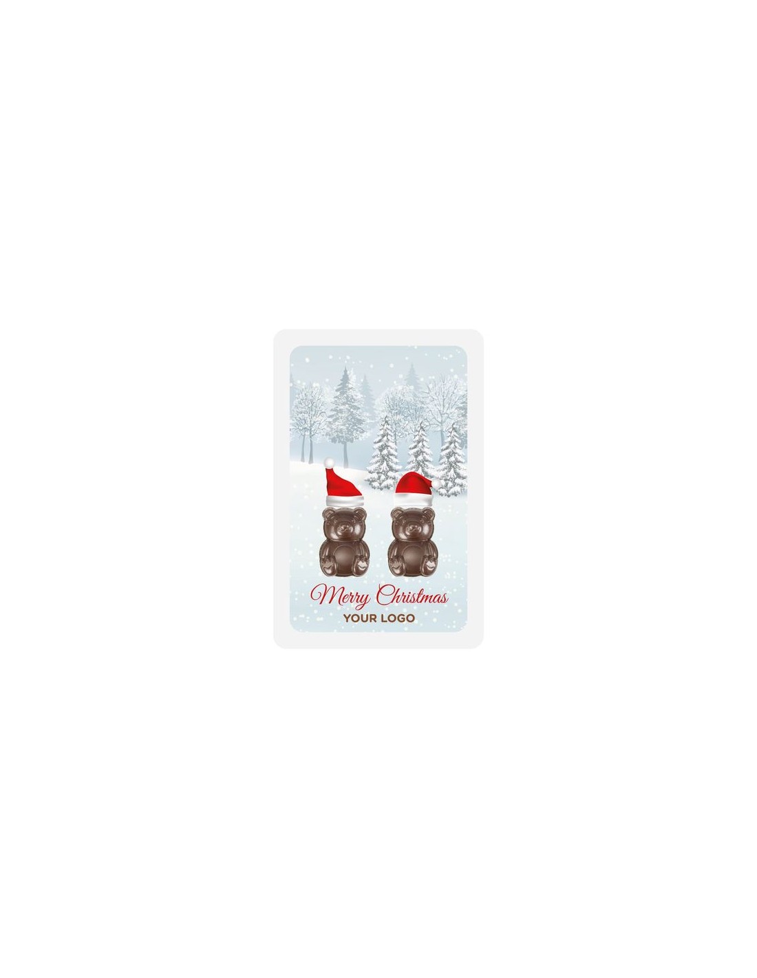 contenido : 2 osos de chocolate (10 g en total)Saboro : chocolate con leche 33% cacao, chocolate blanco 36% manteca de cacao, chocolate negro 54% cacao, chocolate negro 72% cacao, chocolate rubí 47% cacao, chocolate Caramel Gold 40% cacao, chocolate con leche y miel al 33% de cacao, chocolate con leche sin azúcar 33% cacao, chocolate con leche - vegano 42% cacao, chocolate Wholefruit 72% sin azúcares añadidosOpciones de producto : papel blanco, papel kraft o papel crudo con ajot de fibras de hierbaInforomación adicional : moldeado en R-PET (PET reciclado), papel blanco de serie, papel kraft o papel crudo con ajot de fibras de hierba elección opcionalDimensiones : 154 x 102 x 18 mmCantidad Mínimo : 300 piezasFecha de caducidad mínima : 8 mesesTipo de impresión : envasado: digital.