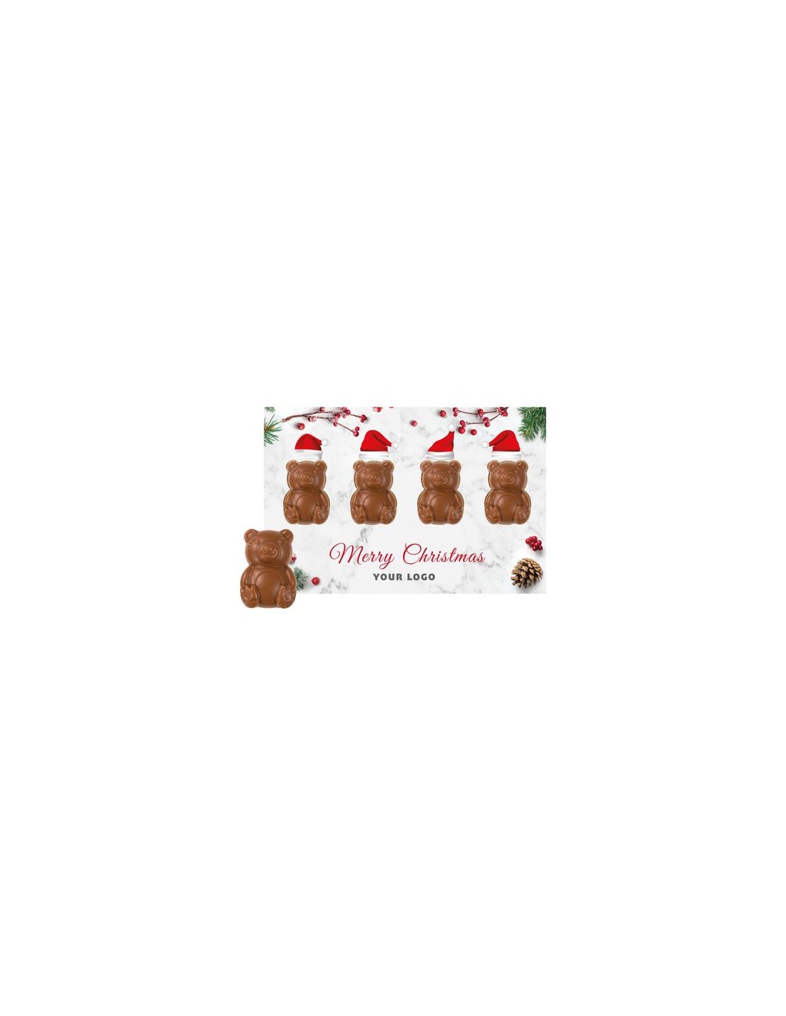 contenido : 4 osos de chocolate (total 30 g)Saboro : chocolate con leche 33% cacao, chocolate blanco 36% manteca de cacao, chocolate negro 54% cacao, chocolate negro 72% cacao, chocolate rubí 47% cacao, chocolate Caramel Gold 40% cacao, chocolate con leche y miel al 33% de cacao, chocolate con leche sin azúcar 33% cacao, chocolate con leche - vegano 42% cacao, chocolate Wholefruit 72% sin azúcares añadidosOpciones de producto : papel blanco, papel kraft o papel crudo con ajot de fibras de hierbaInforomación adicional : moldeado en R-PET (PET reciclado), papel blanco de serie, papel kraft o papel crudo con ajot de fibras de hierba elección opcional, producto adaptado a ser enviado por correoDimensiones : 210 x 140 x 12 mmCantidad Mínimo : 250 piezasFecha de caducidad mínima : 8 mesesTipo de impresión : digital.