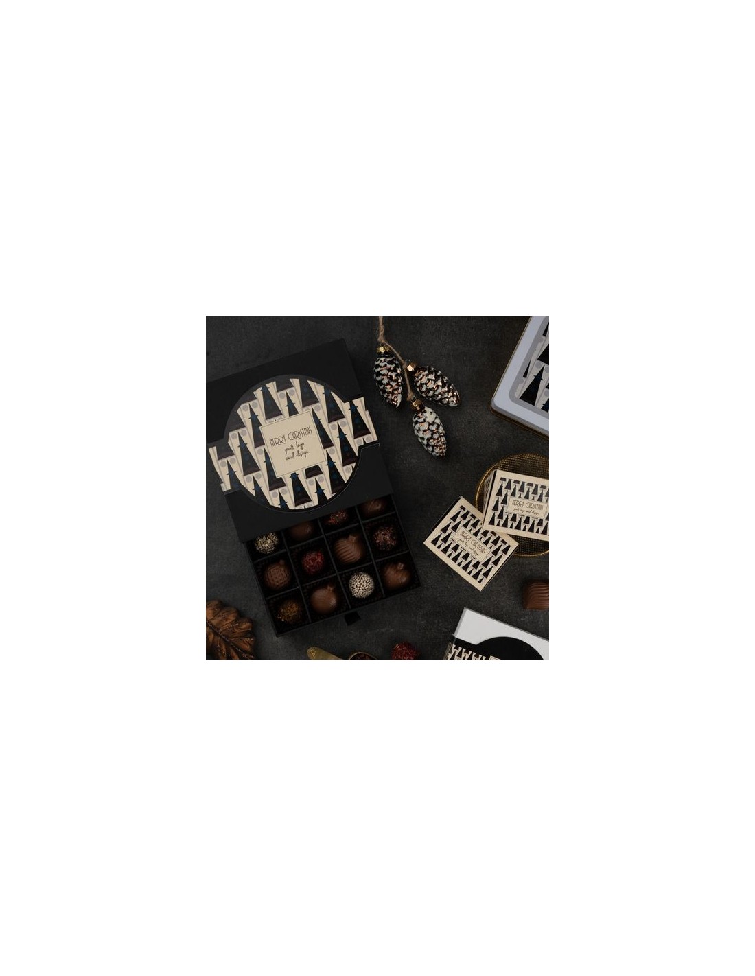 contenido : SURTIDO de boles de Noël pralinés y de truffas Art Déco (170 g en total)Opciones de producto : etiqueta blanca, kraft o crudo con ajot de fibras de hierbaInforomación adicional : lata metálica reutilizable según el principio de "residuo cero", color de la caja: negro, mezcla de sabores de chocolates praliné, mezcla de sabores de truffas Art Déco, papel blanco de serie, papel kraft o papel crudo con ajot de fibras de hierba elección opcionalDimensiones : 153 x 153 x 35 mmCantidad Mínimo : 50 exFecha de caducidad mínima : 4 mesesTipo de impresión : digital.