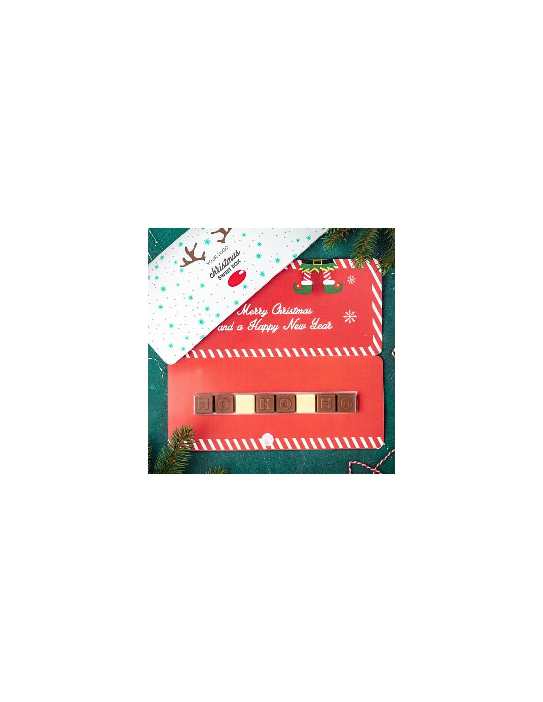 contenido : une tableta de chocolate con un texto personalizado o 8 chocolates con texto personalizado (30 g en total)Saboro : chocolate con leche 33% cacao, chocolate blanco 36% manteca de cacao, chocolate negro 54% cacao, chocolate negro 72% cacao, chocolate rubí 47% cacao, chocolate Caramel Gold 40% cacao, chocolate con leche y miel al 33% de cacao, chocolate con leche sin azúcar 33% cacao, chocolate con leche - vegano 42% cacao, chocolate Wholefruit 72% sin azúcares añadidosOpciones de producto : chocolate sos forome de tableta o de cubitos individuales, impresión recto-verso, papel blanco, papel kraft o papel crudo con ajot de fibras de hierbaInforomación adicional : moldeado en R-PET (PET reciclado), número de caracteres del texto: 8, papel blanco de serie, papel kraft o papel crudo con ajot de fibras de hierba elección opcional, posibilidad de personalizar el envasado y el chocolate (gofrado sobre el chocolate)Dimensiones : 230 x 100 x 12 mmCantidad Mínimo : 100 exFecha de caducidad mínima : 8 mesesTipo de impresión : chocolate: gofrado, envasado: digital.