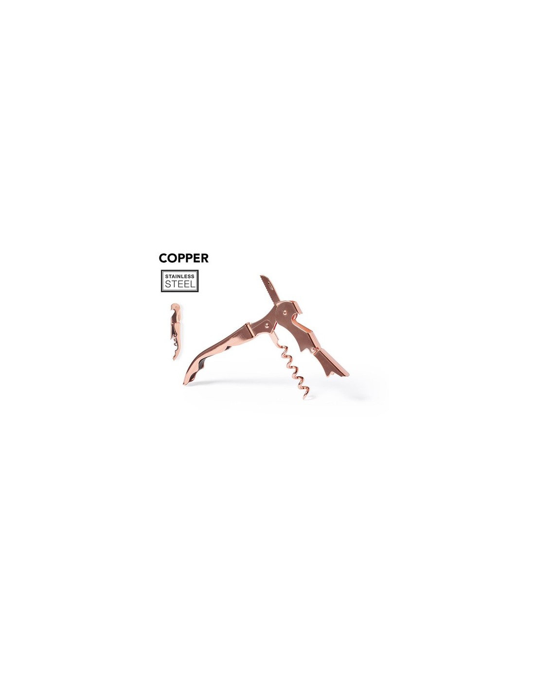 Sacacorchos de 2 tiempos fabricado en acero inox, con recubrimiento exterior en cobre galvanizado. Cortacápsulas integrado y presentado en caja individual de diseño. Composition : Acero Inox.