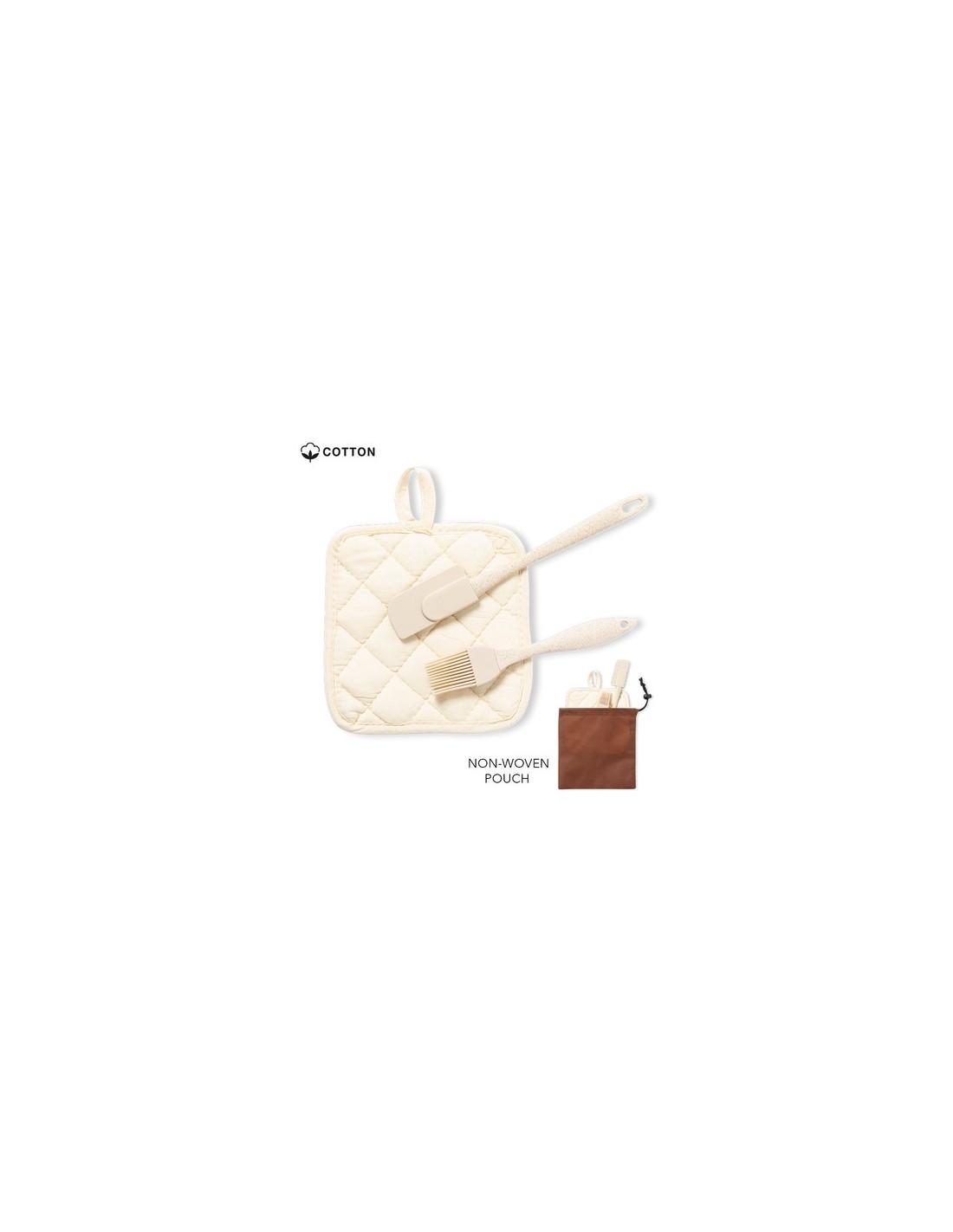 Set de cocina de 3 piezas presentado en funda marrón con cordón de cierre. Incluye: Espátula y brocha de silicona en tono natural, con mangos troquelados en resistente PP veteado. Agarrador en 100% algódón de acabado natural, con cinta para colgar. 3 Piezas. Funda Non-Woven Composition : PP/ Silicona/ Algodón.