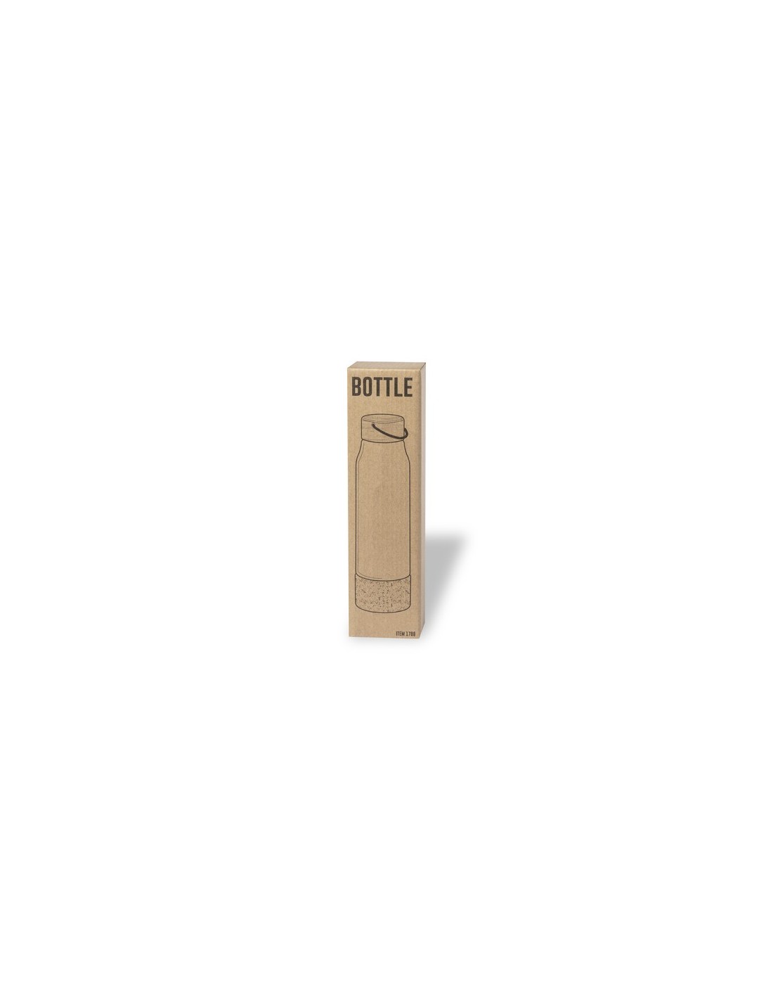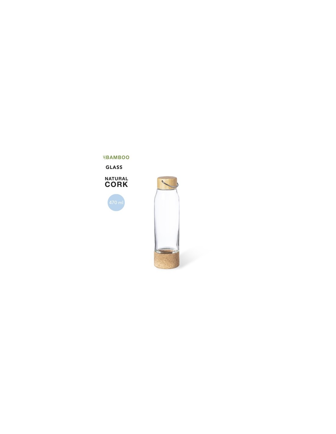Bidón de línea nature y 470 ml de capacidad. Cuerpo fabricado en cristal, con base en corcho. Incluye original tapón a rosca de bambú con asa integrada. Presentado en caja individual de diseño eco. 470 ml Composition : Cristal/ Bambú/ Corcho.