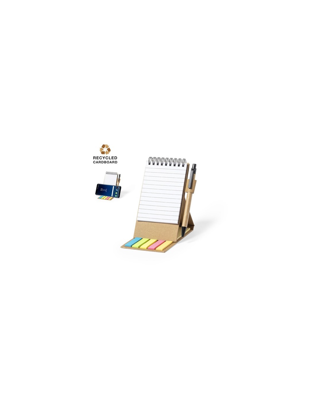 Bloc de notas de línea nature convertible en soporte para smartphone y fabricado en cartón reciclado. Incluye: Bloc de anillas de 30 hojas blancas, con disposición a una raya y soporte para bolígrafo. Bolígrafo en cartón reciclado con detalles en negro, de mecanismo pulsador y en tinta azul.25 notas adhesivas medianas.125 mininotas adhesivas en varios colores. Bloc 30 Hojas. 25 Notas Adhesivas 7,5 x 7,5 cm. 125 Mininotas Adhesivas 1,2 x 5 cm. Bolígrafo Cartón Reciclado Incluido Composition : Cartón Reciclado.