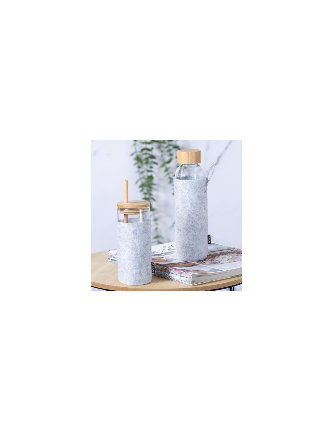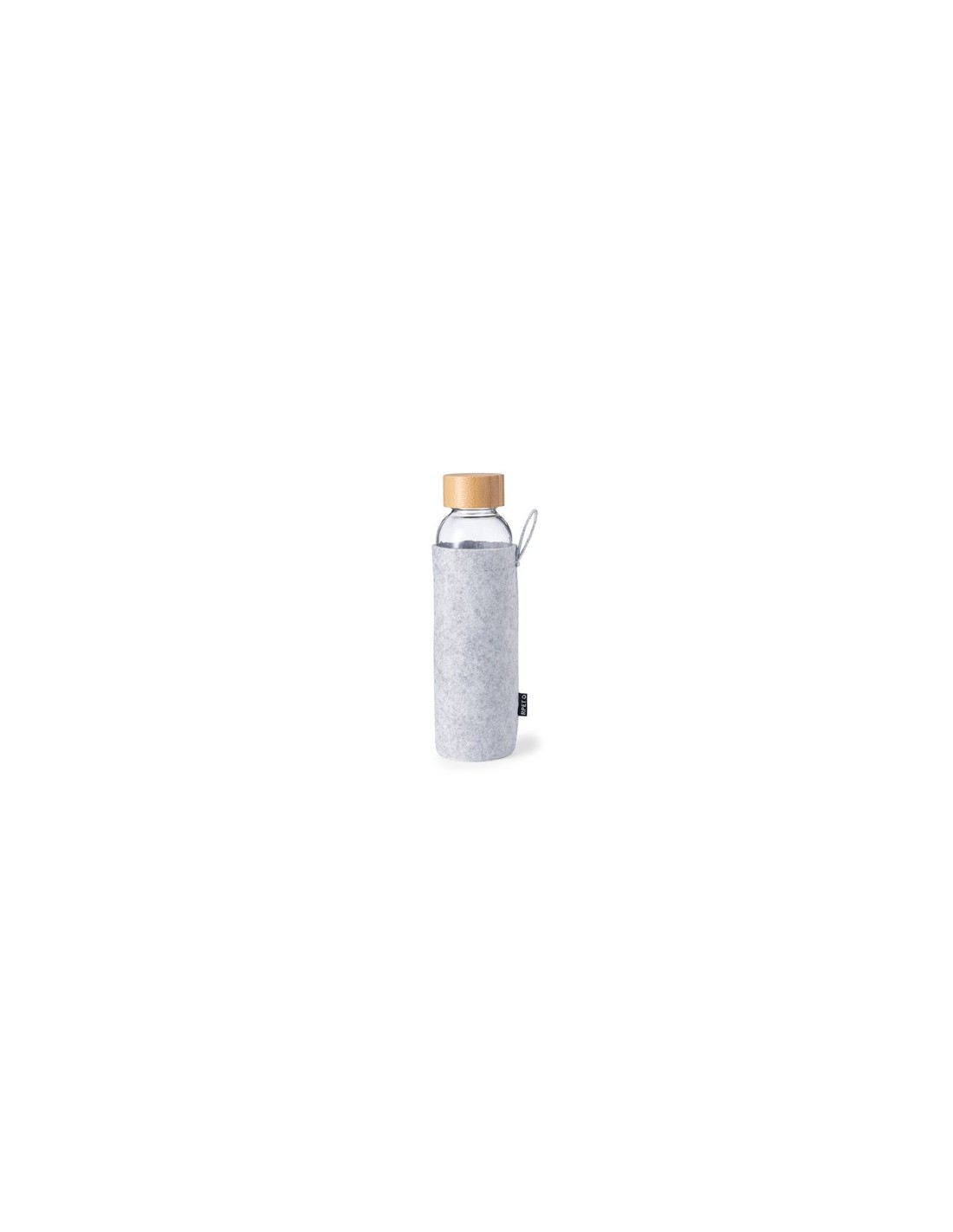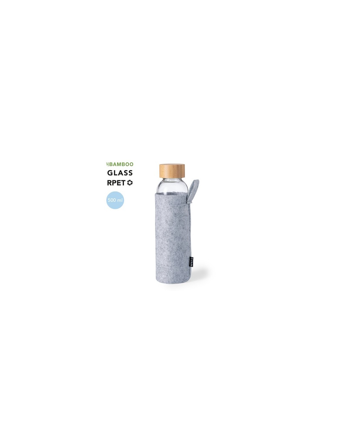 Bidón de 500 ml de capacidad. Fabricado en resistente cristal y con tapón a rosca de bambú. Incluye funda de suave fieltro RPET con práctica asa de transporte. Libre de BPA. Con etiqueta distintiva RPET. Presentado en caja individual de diseño eco.El fieltro RPET reciclado es fruto de la combinación del proceso de reciclaje de materiales plásticos junto a la técnica milenaria de fabricación del fieltro, dando como resultado un material de eco-tendencia que, además de ser de origen reciclado, también se convierte en reciclable. 500 ml. Funda Fieltro RPET Composition : Cristal/ Bambú.