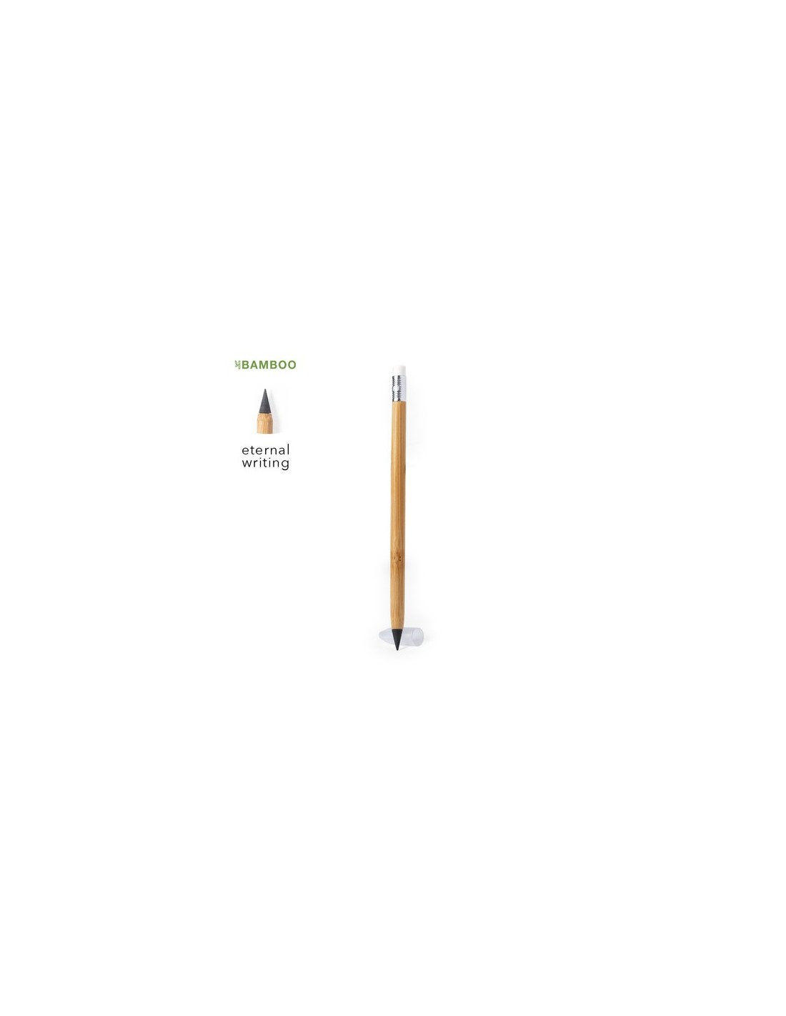 Lápiz eterno fabricado en bambú. Reutilizable y con escritura infinita, para así usar siempre el mismo lápiz y no generar residuos. Incluye goma de borrar en la parte superior del lápiz.Materiales como el bambú fomentan la utilización de materias primas naturales reduciendo las emisiones contaminantes. Además, el bambú proviene de una planta de gran resistencia y versatilidad, con crecimiento y regeneración rápida, siendo una excelente alternativa al uso de madera tradicional. Composition : Bambú.