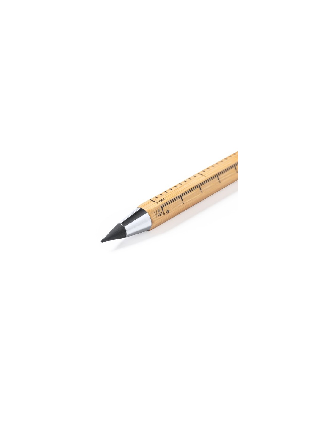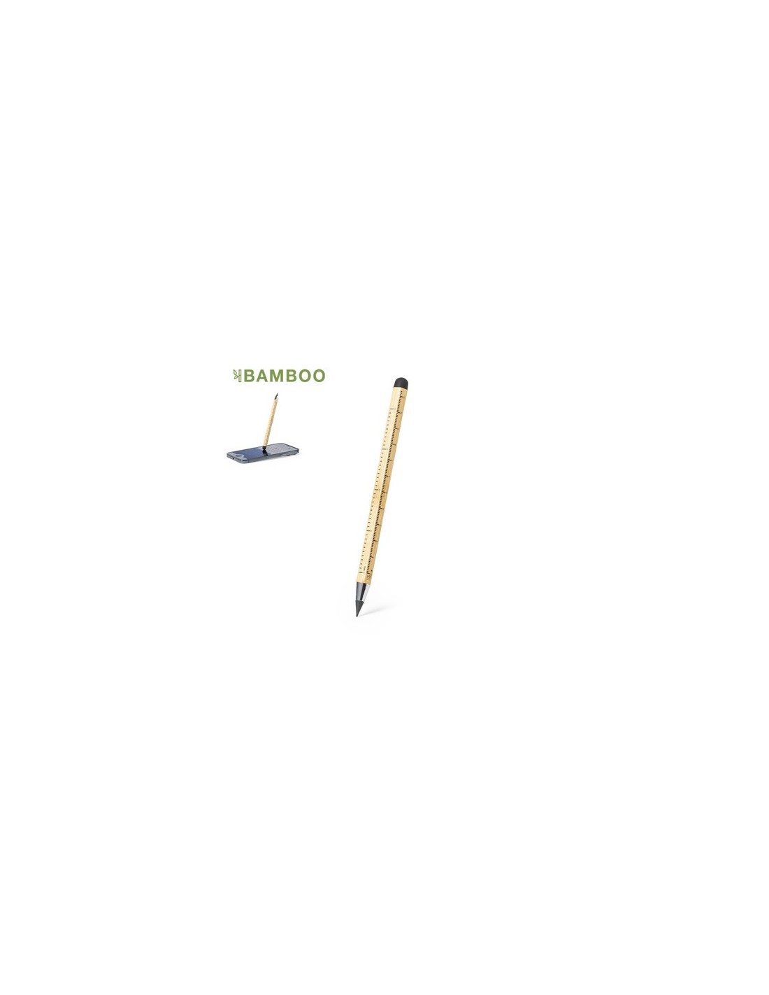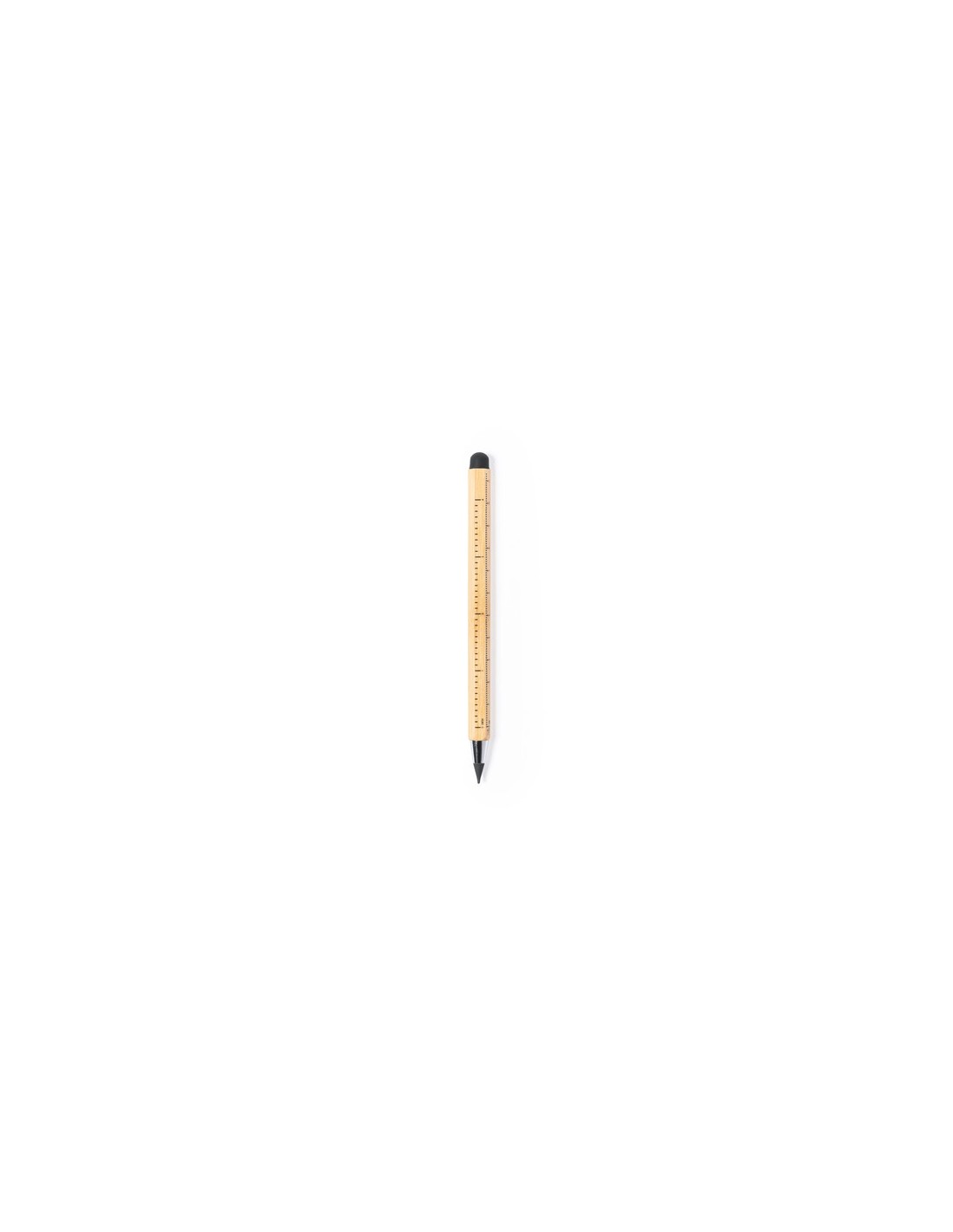 Lápiz eterno multifunción fabricado en bambú. Funciones lápiz, puntero táctil y regla, con medidas en centímetros (11) y pulgadas (4). Reutilizable y con escritura infinita, para así usar siempre el mismo lápiz y no generar residuos. 3 Funciones Composition : Bambú.