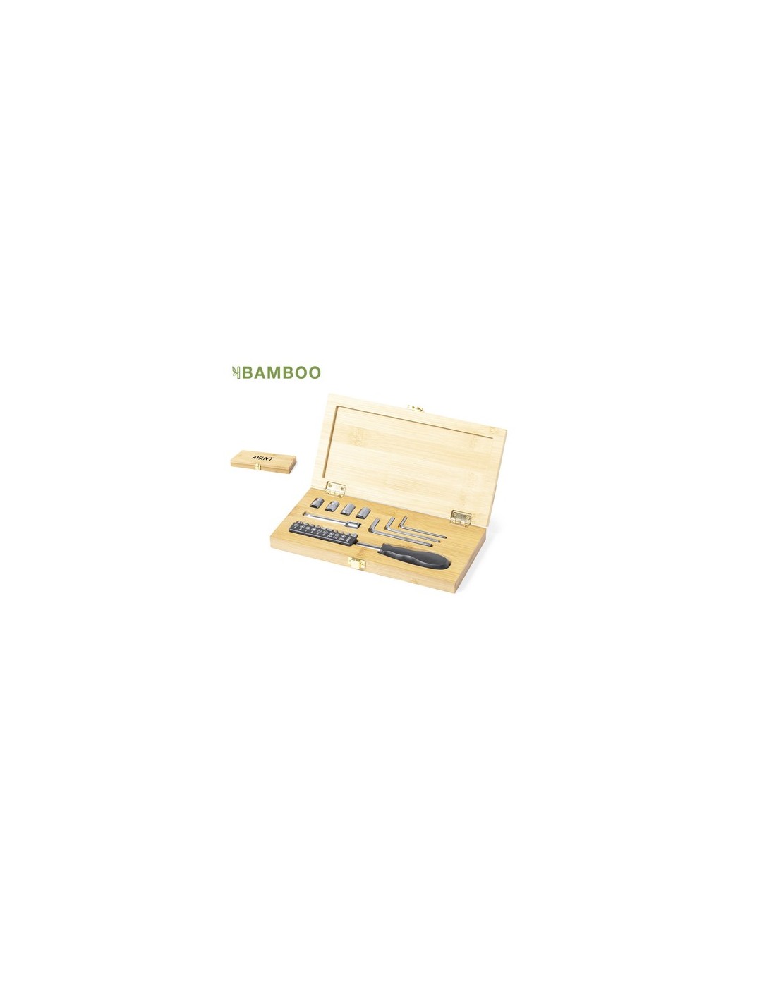 Set de herramientas de línea nature, presentado en resistente caja de bambú con cierre metálico. Con interior troquelado en bambú para un perfecto ajuste de las herramientas. Incluye destornillador con multitud de puntas planas, philips, hexagonales y torx juego de llaves allen en distintas medidas y llaves de tubo con accesorio alargador. Presentado en caja individual de diseño kraft. 19 Accesorios Composition : Bambú.