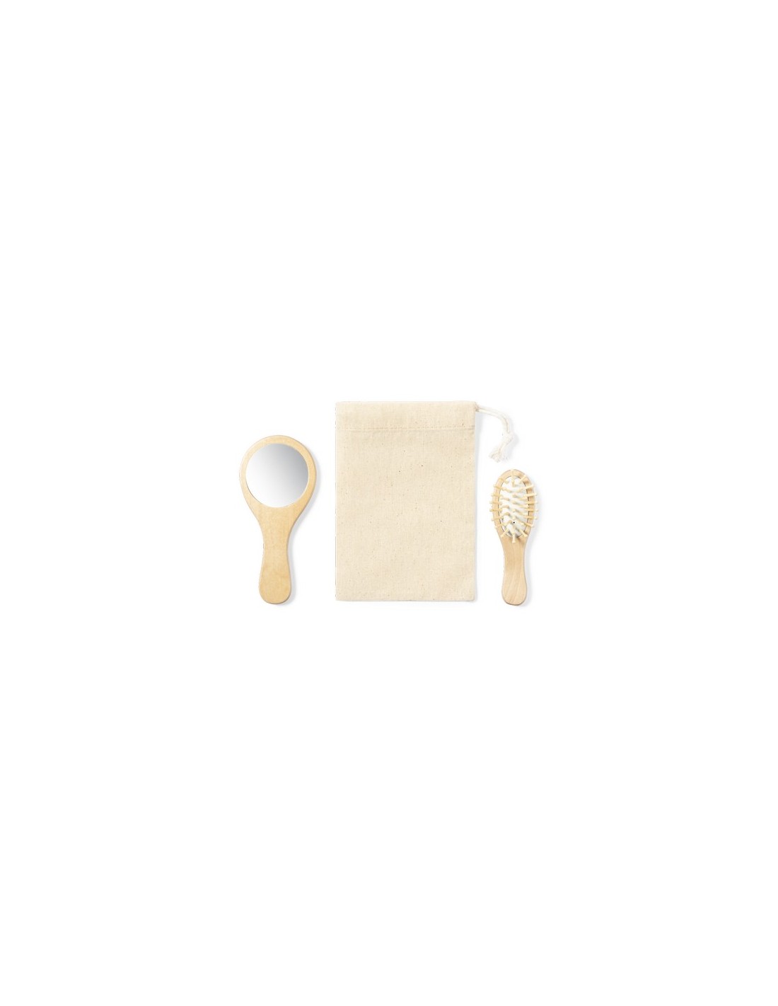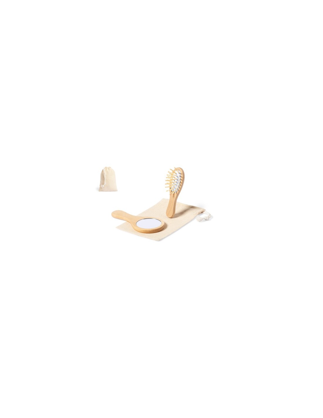 Set de espejo y cepillo, fabricados en madera natural. Presentados en funda 100% algodón, con cierre de cordón. 2 Piezas. Funda Algodón Composition : Madera.