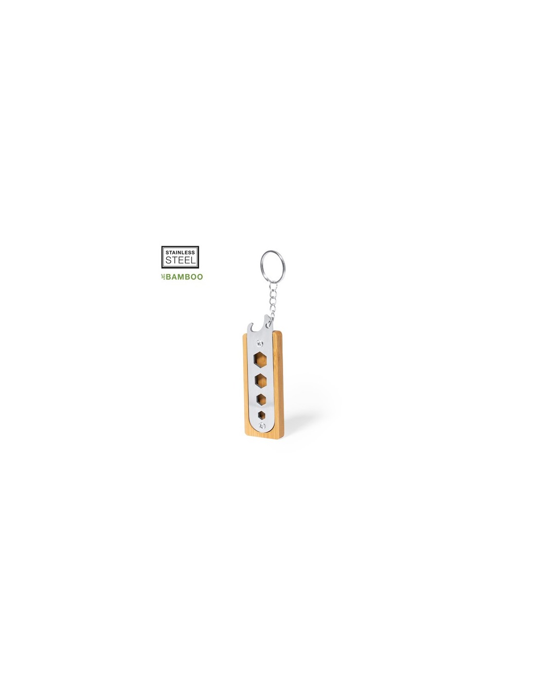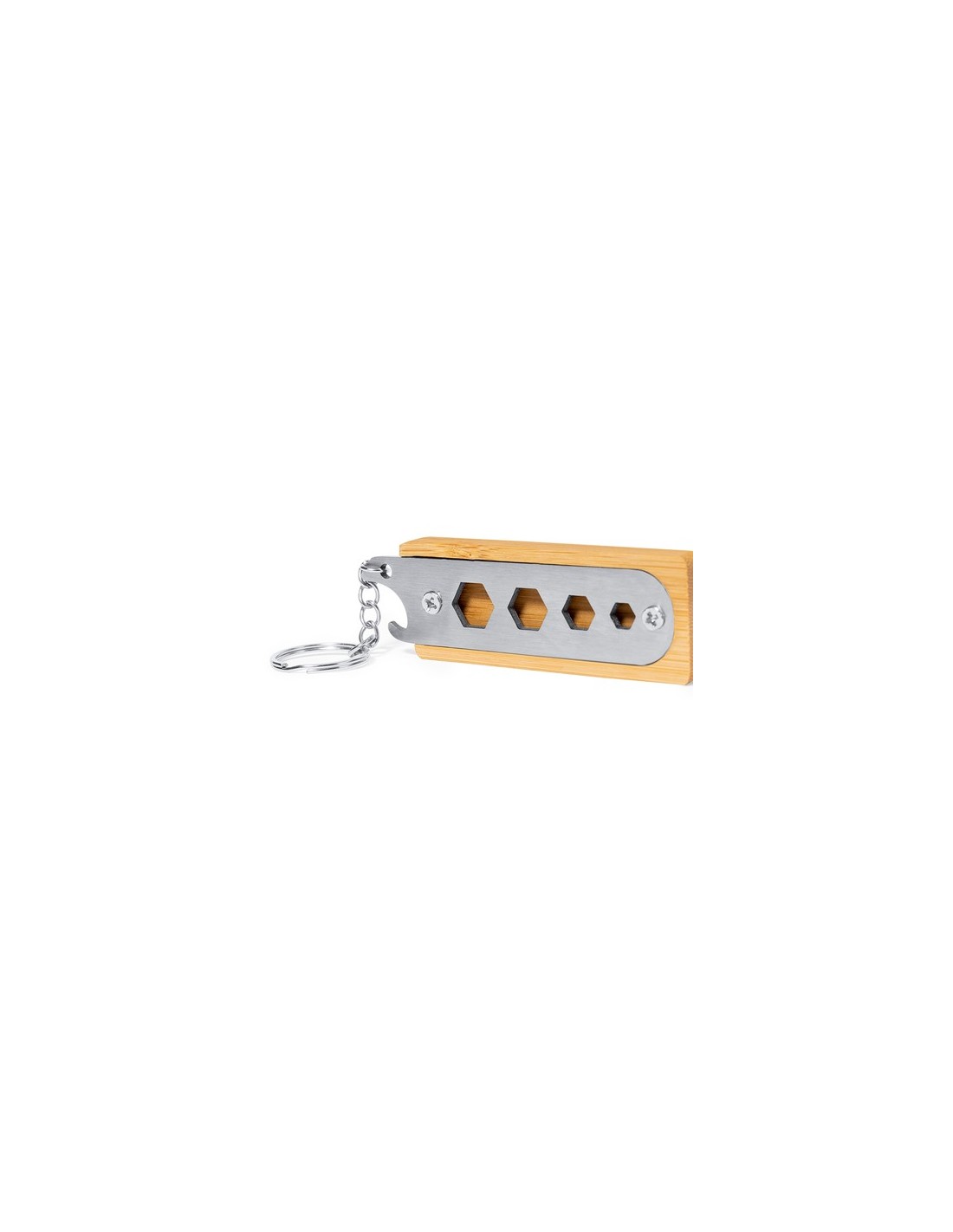 Llavero multiherramienta fabricado en resistente acero inox y bambú. Con práctico conjunto de 4 llaves fijas hexagonales troqueladas y abrebotellas. Presentado en caja individual de diseño kraft. 5 Funciones Composition : Bambú/ Acero Inox.