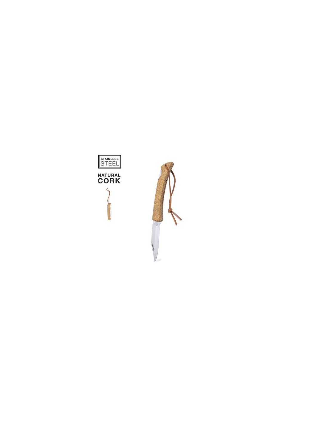 Navaja de línea nature con hoja en acero inox y mango fabricado en corcho natural. Con bloqueo y muesca en la hoja para fácil apertura. Cordón a juego en polipiel y presentada en caja individual de diseño kraft. Con Bloqueo Composition : Corcho/ Acero Inox.