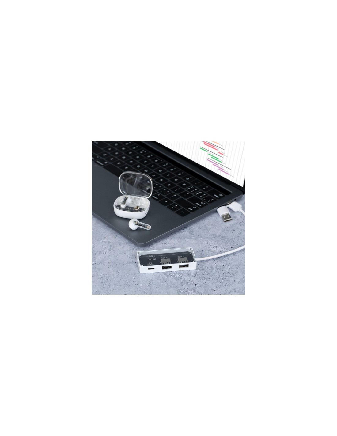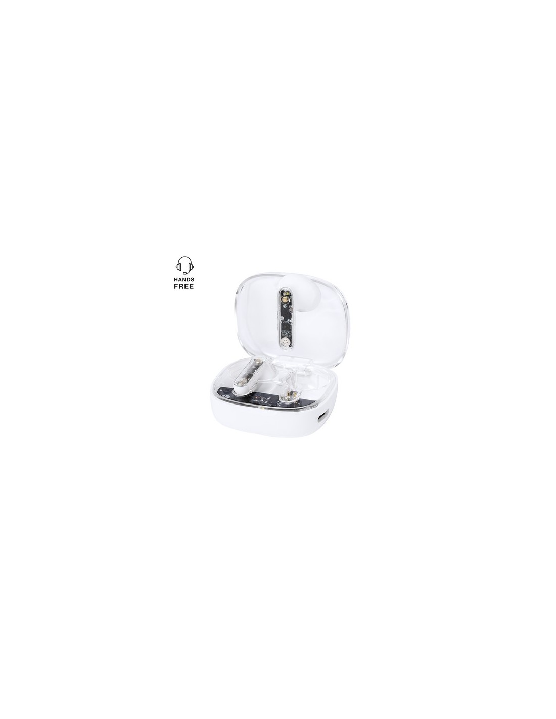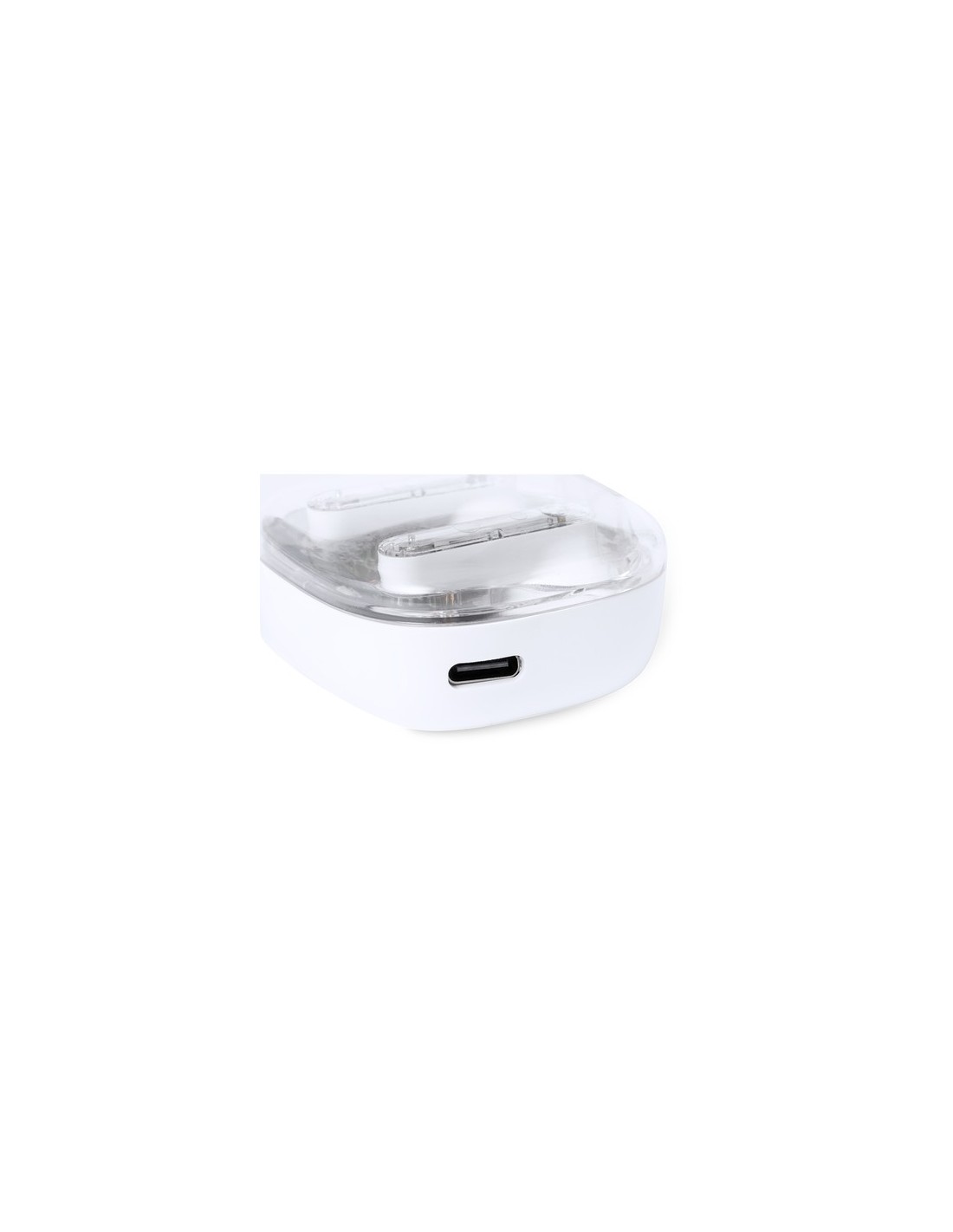 Auriculares intraurales en distintivo diseño transparente. Conexión Bluetooth 5.3 y gran autonomía . De diseño ergonómico, incluyen botón de control táctil integrado en el auricular, con base de carga a juego e indicadores de estado de carga. Función manos libres. Puerto de carga con entrada Tipo C (cable incluido). Presentados en caja individual de diseño kraft y en bolsa reciclada. Conexión Bluetooth. Batería 30 mAh/ Base Carga 200 mAh