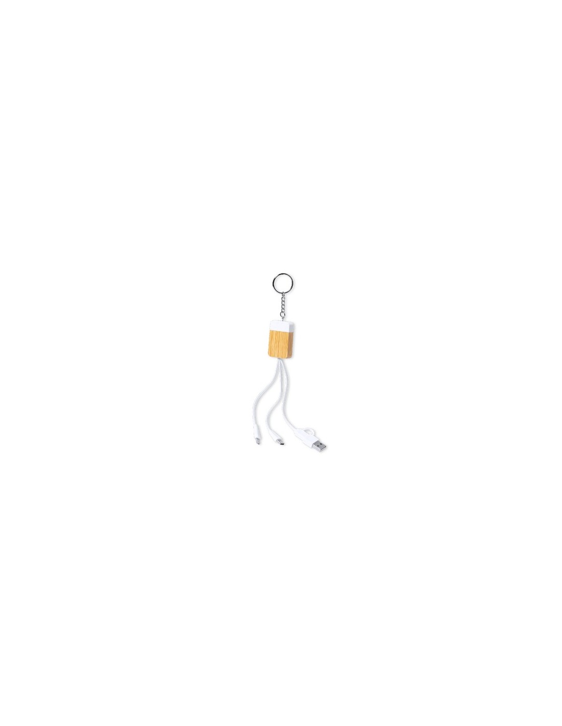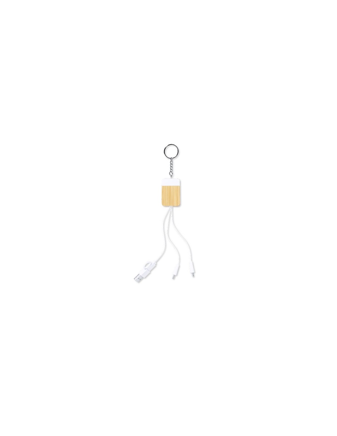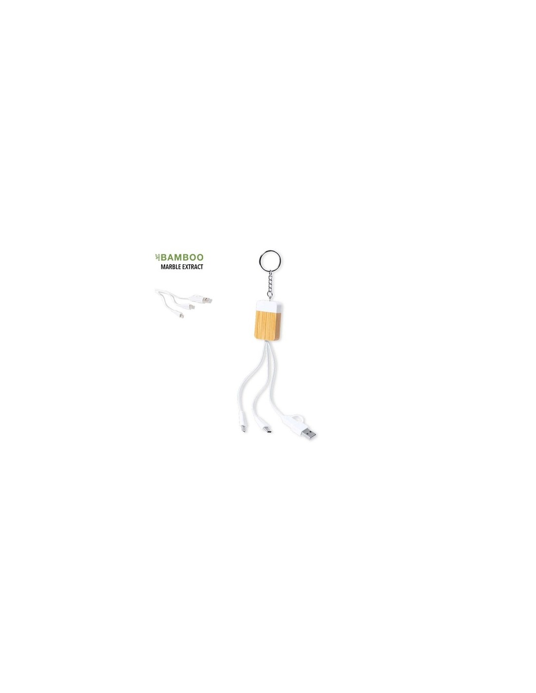 Cable cargador con llavero, fabricado en bambú y con detalle en extracto de mármol. Incluye conexiones de entrada USB y Tipo C, con salidas Lightning, Micro USB y Tipo C 5VDC 2.4A. Presentado en bolsa individual de diseño kraft. Conexión Micro USB, Tipo C y Lightning 5V DC 2.4A Composition : Bambú/ Extracto de Mármol.