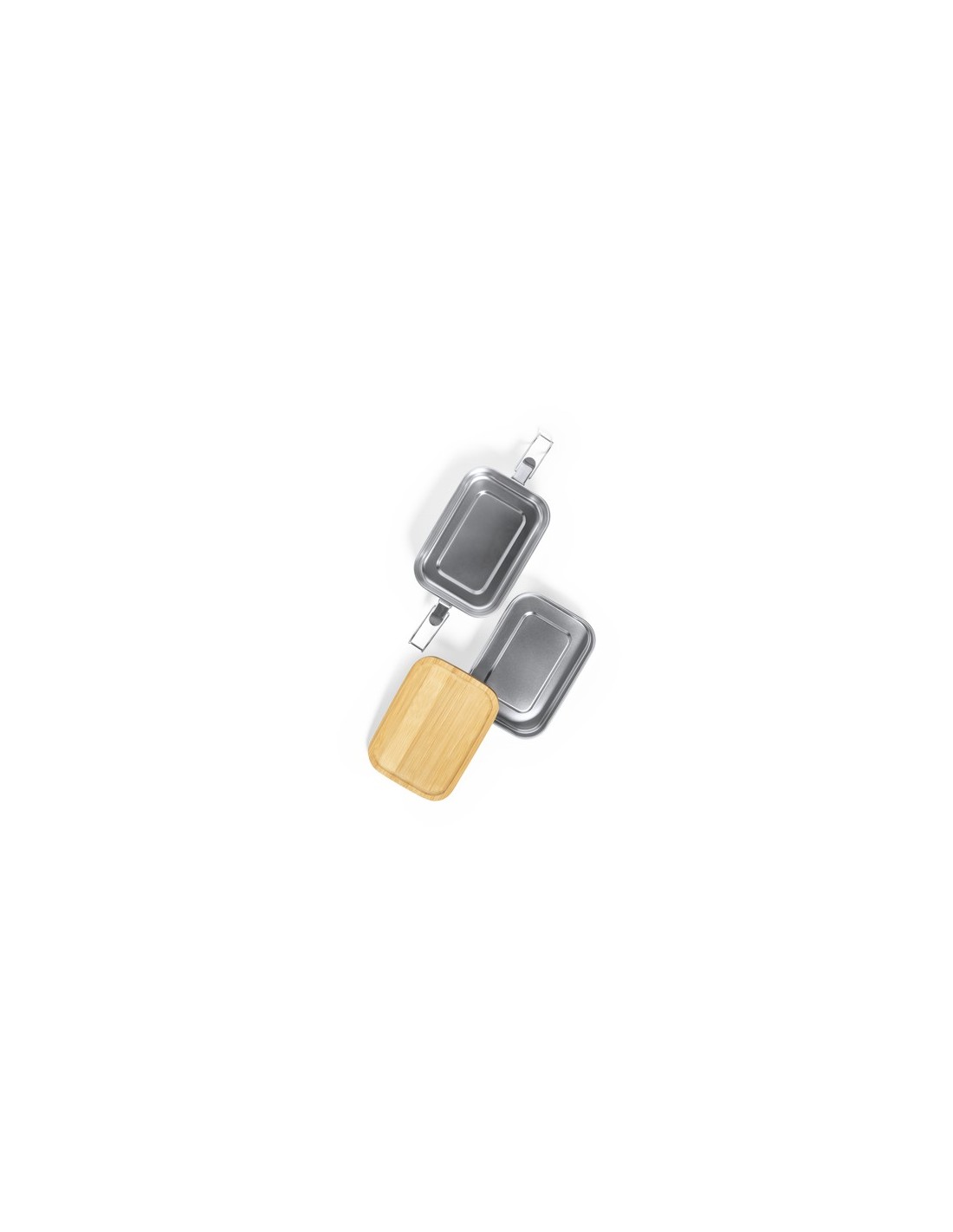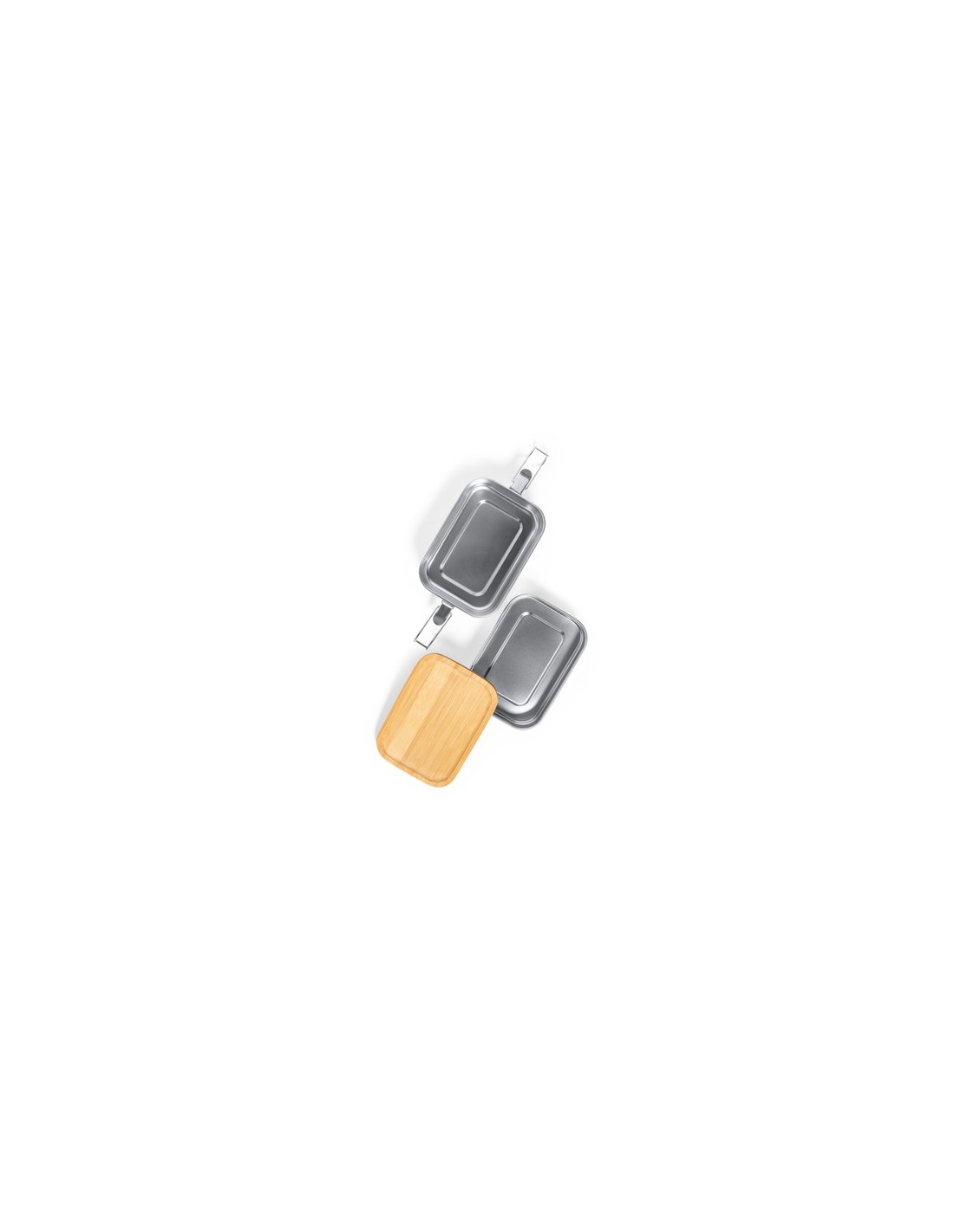 Fiambrera de 940 ml de capacidad, fabricada en acero inox reciclado. Dos compartimentos de 340 ml y 600 ml, con tapa hermética en bambú y cierres de seguridad con distintivo acero inox reciclado. Presentada en caja individual de diseño. El acero es uno de los materiales más demandados y que puede encontrarse casi en todas partes, desde productos de uso diario a grandes construcciones. Con innumerables propiedades, entre las que cabe destacar la durabilidad y su alto grado de reutilización, convirtiéndolo en una alternativa muy valorada en soluciones de sostenibilidad. Debidamente tratado, permite obtener nuevos recursos de infinita utilización. 2 Compartimentos 340 y 600 ml. Cierre Seguridad Composition : Acero Inox Reciclado/ Bambú.