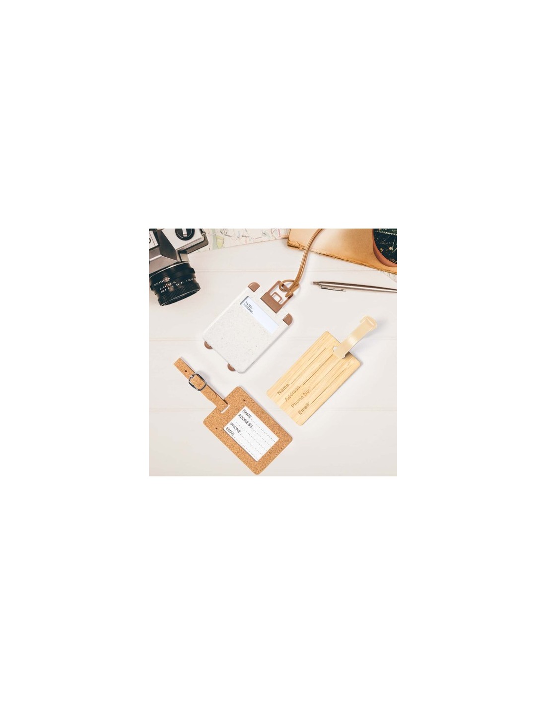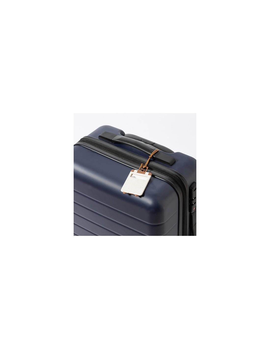 Identificador para maletas de línea nature y original diseño trolley, fabricado en caña de trigo. Con resistente cinta de acople y tarjeta de identificación en español e inglés.La caña de trigo fomenta la utilización de materias primas naturales, reduciendo así las emisiones contaminantes. Composition : Caña de Trigo/ ABS.