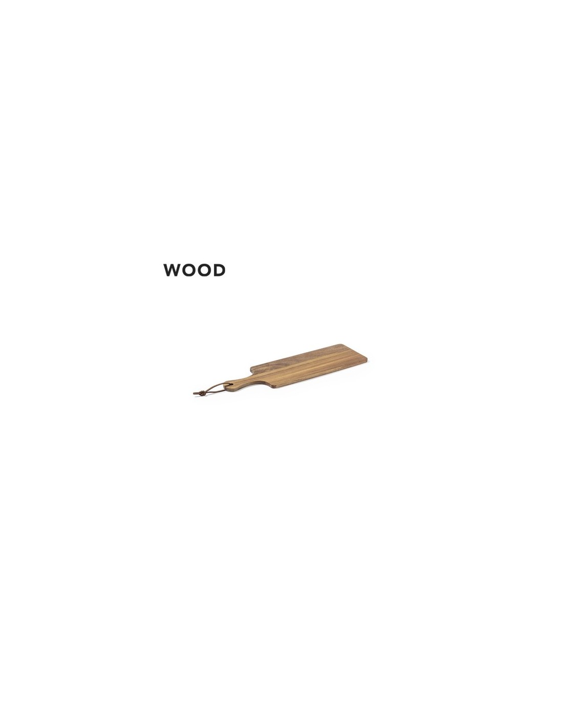 Tabla de corte y presentación fabricada en madera natural. En formato rectangular, con asa y cordón en resistente polipiel a juego. Composition : Madera.